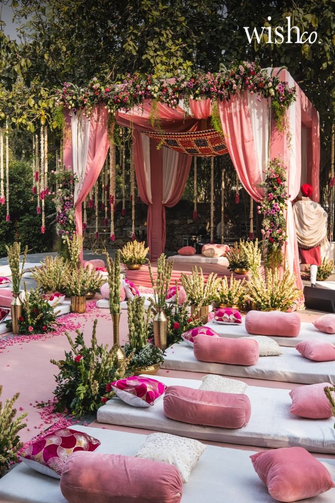 This floor-seating arrangement is the ultimate “Desi” hangout spot. Low wooden platforms covered in colorful Phulkari cushions and bolsters make for a relaxed, conversational vibe. I’ve spent many winter afternoons in setups like this, and they are truly the heart of the home. To make this work in a garden, I recommend using a large outdoor mat as a base to protect your cushions from moisture. It’s the perfect way to embrace desi backyard styling for your next family get-together!