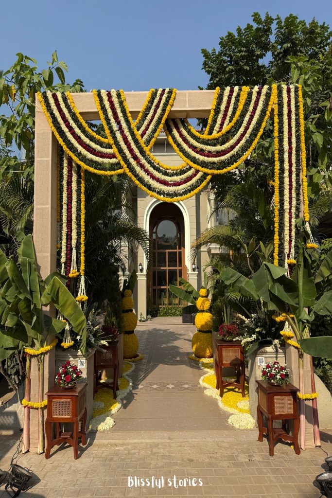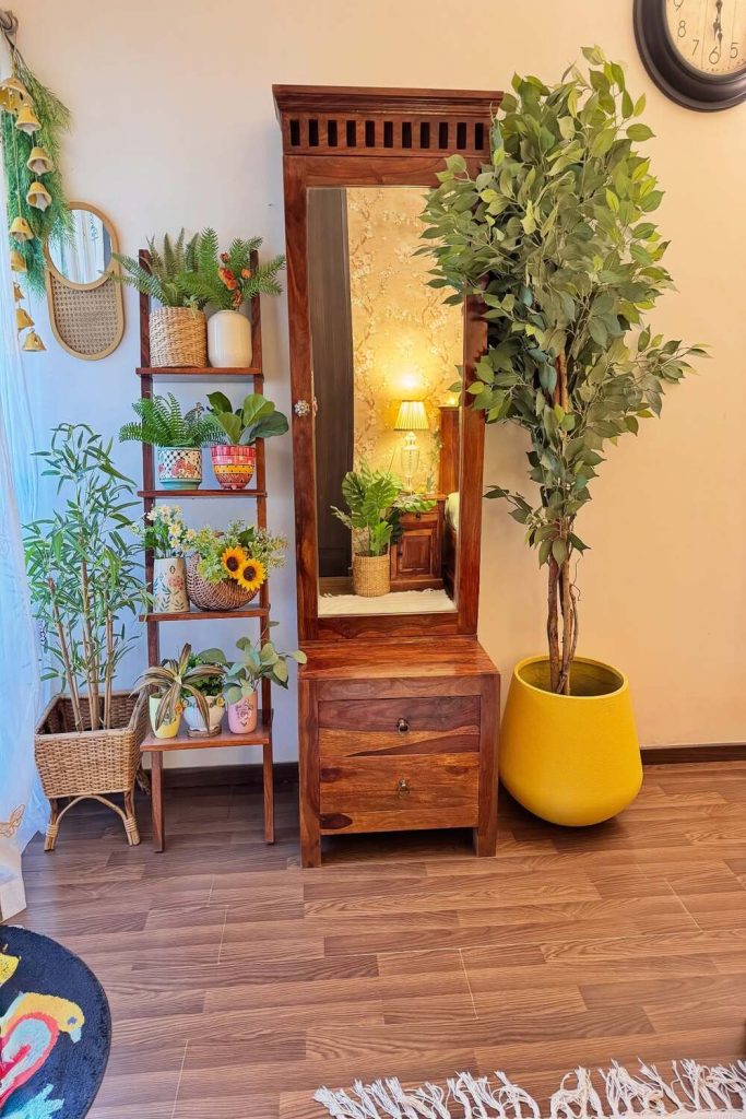 This is proof that you don’t need a yard to have a garden. These small brass “Lotas” repurposed as hanging herb planters are genius! Hanging them on a simple iron grid turns a kitchen balcony into a functional piece of art. I love the idea of plucking fresh mint or coriander right from your “wall.” It’s a beautiful blend of utility and heritage. It’s these small, clever flower decor ideas that make a house feel like a home.