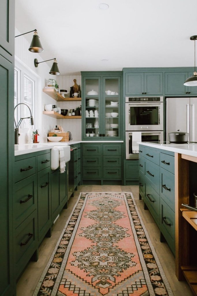 Olive green cabinets bring earthy elegance to this kitchen, paired with gold hardware for a luxe touch. Built-in shelves and pull-out drawers offer clever kitchen storage ideas, perfect for small spaces. The muted green ties into 2025’s sustainable kitchen design trends. I love how it feels grounded yet stylish. Want this look? Pair with natural textures like wood or stone. What’s your favorite earthy tone? Share below and pin this for your kitchen remodel. This is ideal for cozy kitchen ideas with a modern twist!