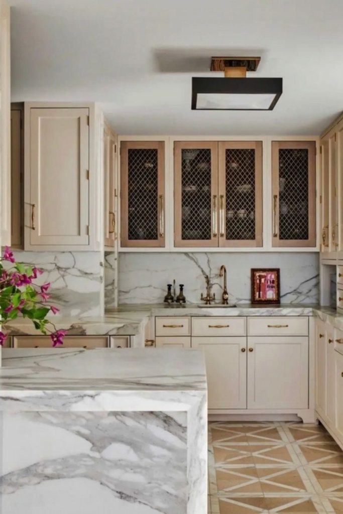 12. Vintage Charm with Glass-Front Cabinets