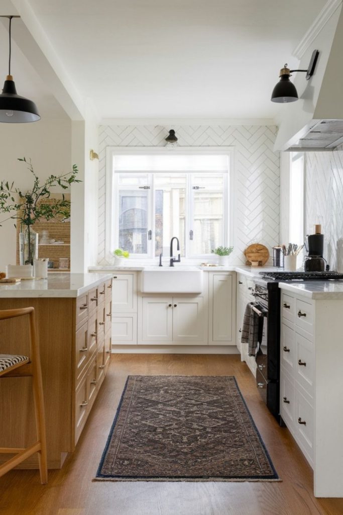 Shaker-style cabinets in soft cream bring timeless elegance to this kitchen. Matte black pulls add a modern edge, while deep drawers and pull-out racks offer smart kitchen storage ideas. The natural wood countertop nods to sustainable kitchen design, adding warmth. I’ve seen Shaker styles shine in every kitchen size, from cozy to grand. Want a classic look that lasts? This is it. Try adding woven baskets for extra charm. What’s your favorite cabinet style? Share below and pin this for your dream kitchen inspo. It’s perfect for timeless kitchen decor trends!