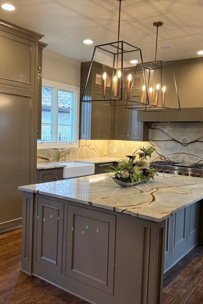 14. Earthy Elegance with Olive Green Cabinets