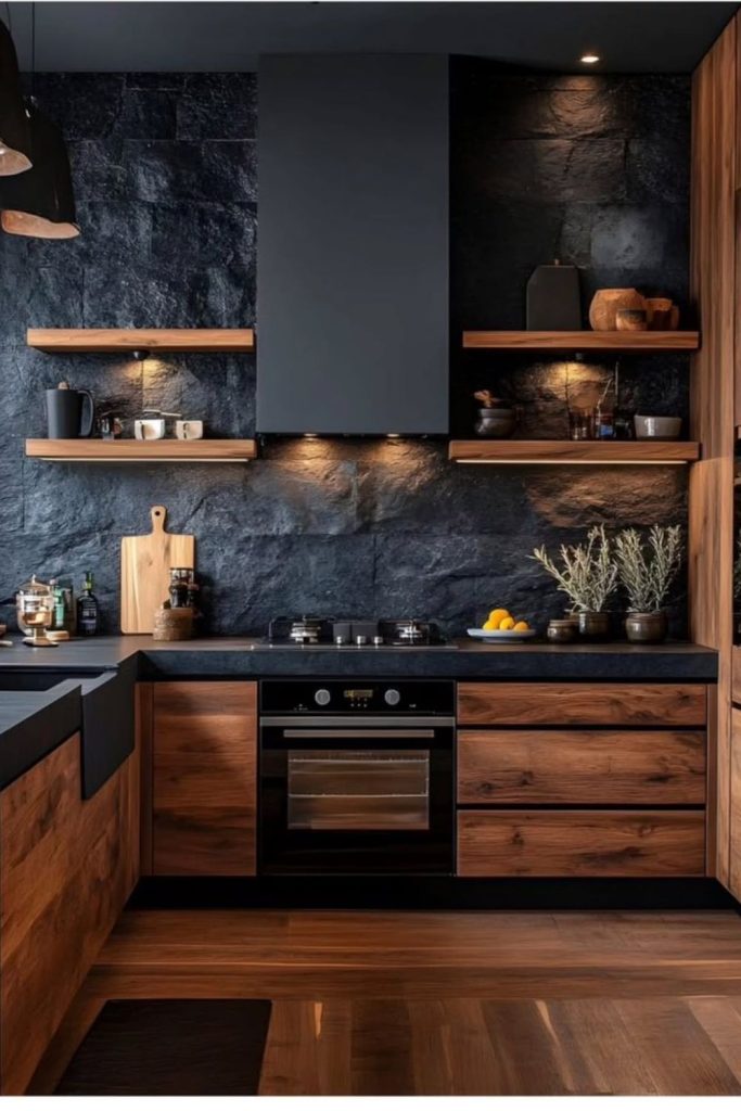 Charcoal gray cabinets and rust tiles make a bold kitchen. Dark colors feel cozy. Wooden shelves add warmth. Matte black fixtures look modern. A single light adds drama. Add a green plant for freshness. Want a cozy retreat? Save this idea and share how you’d use rust tones at home!