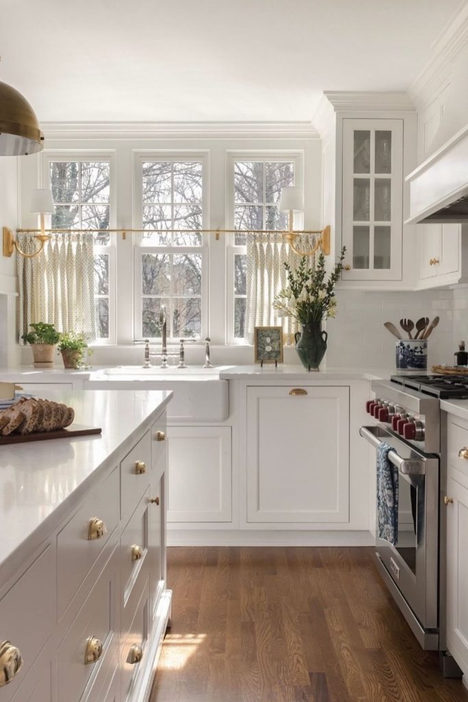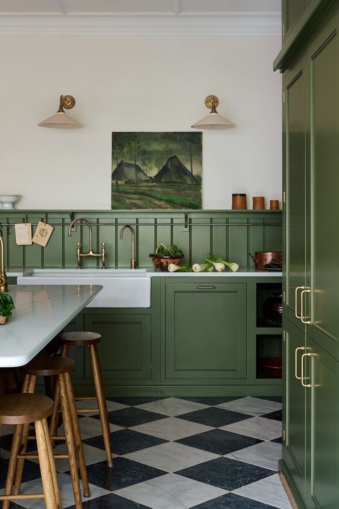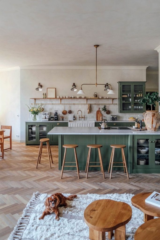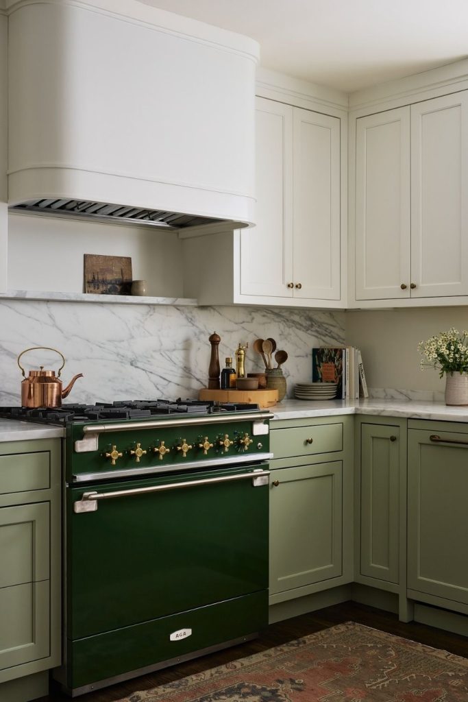 Emerald cabinets with white walls make a rich 2025 kitchen. The green looks bold and regal. Marble counters add style. Brass handles add warmth. Emerald makes a statement without being too much. Add a linen runner for softness. This style is great for a bold, elegant kitchen. Save this and share how you’d use emerald!