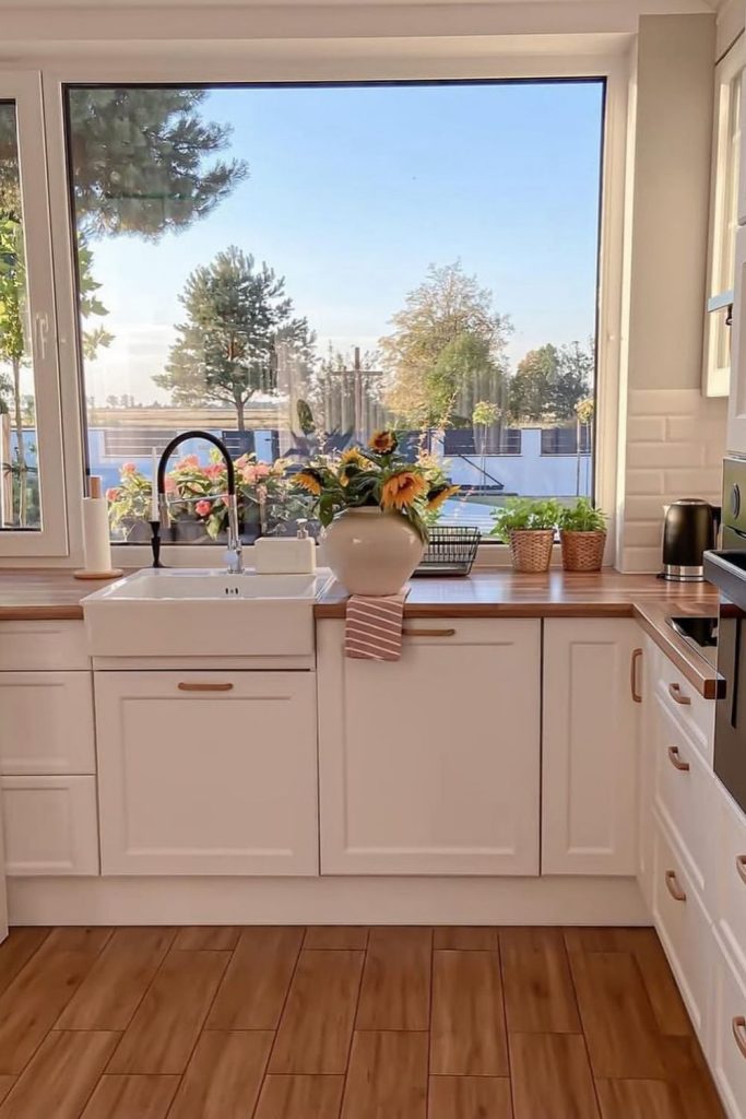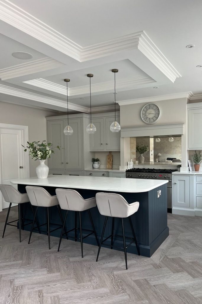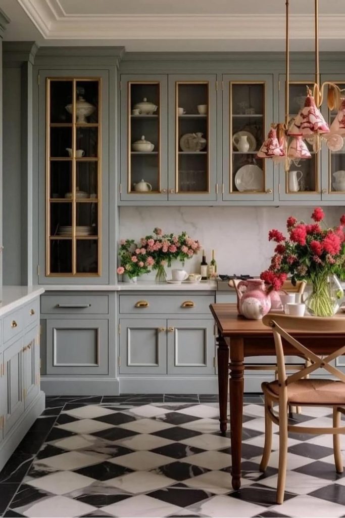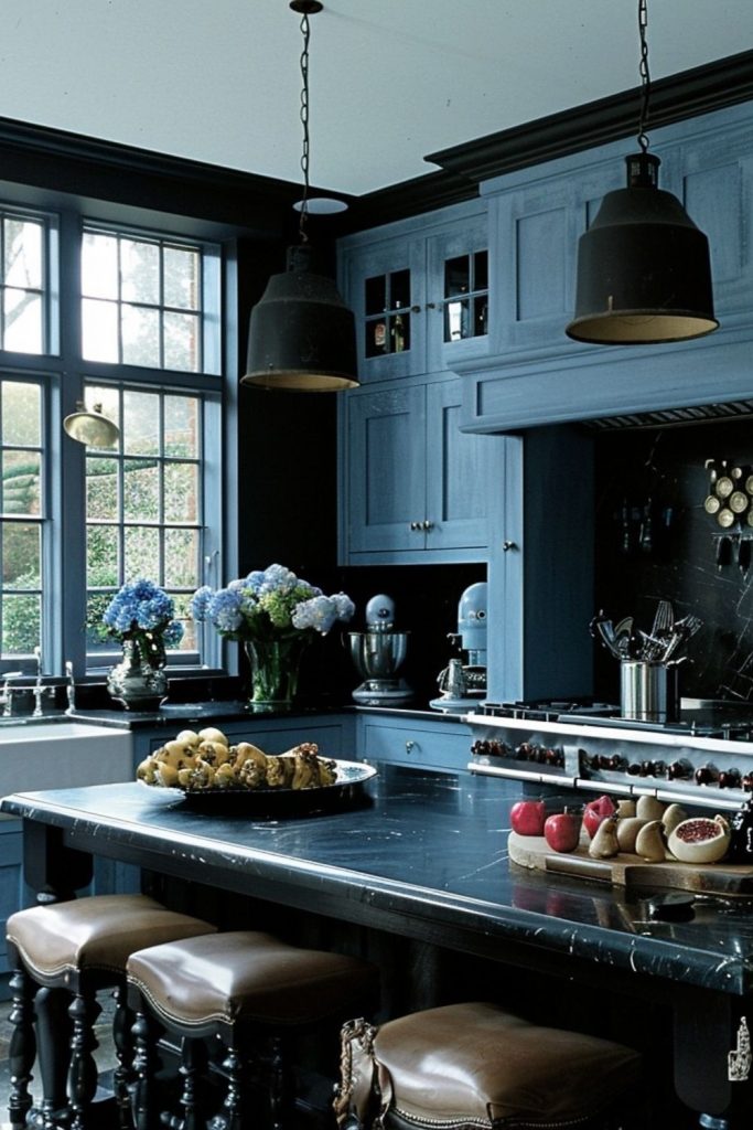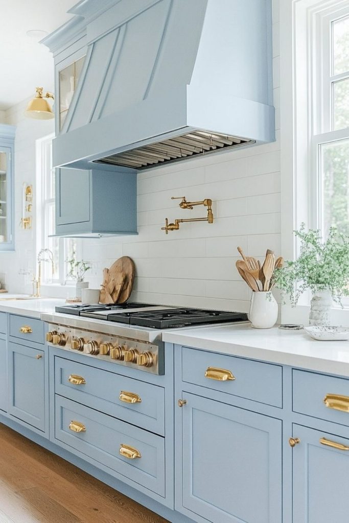 Muted blue cabinets with wood accents make a calm 2025 kitchen. The blue feels soft and peaceful. Bamboo shelves add warmth. White tiles keep it fresh. Add a ceramic jug for a small personal touch. This style is cozy and useful. Want a calm kitchen? Save this look and share how you’d use blue cabinets!