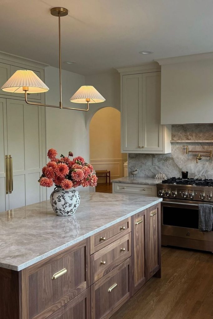 Warm taupe cabinets with soft sage accents make a calm 2025 kitchen. The neutral colors feel timeless. Quartz countertops last long. Brass pendant lights add charm. Add a ceramic vase for a personal touch. This combo is cozy and practical. Want a serene kitchen? Pin this idea and share your favorite neutral combos!