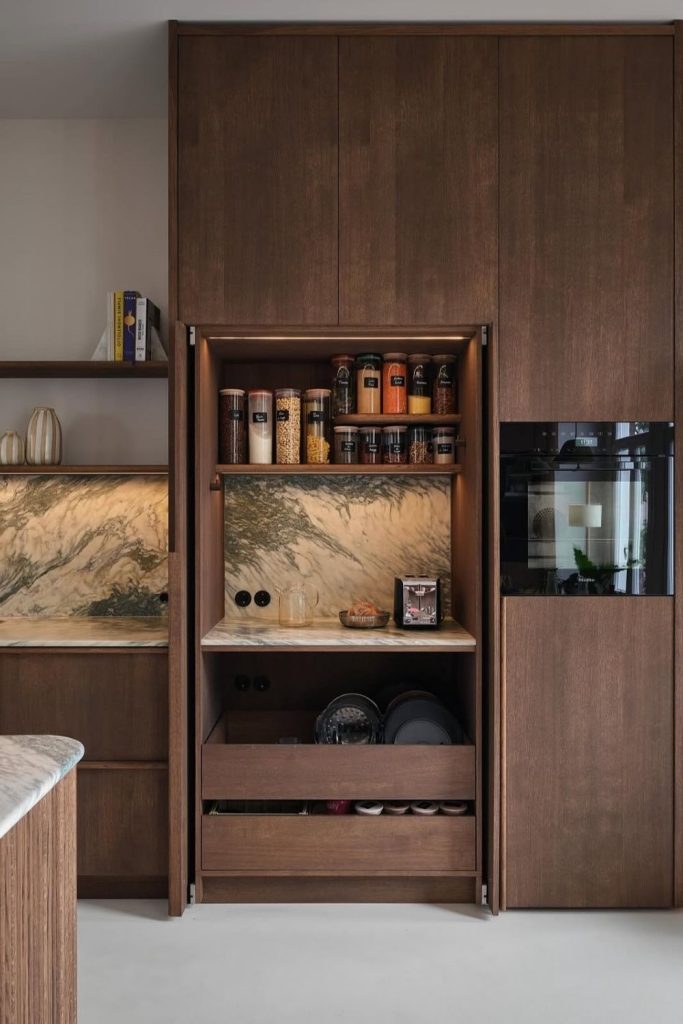 Navy blue cabinets stand out. Walnut countertops feel rich and classy. Brushed brass handles look fancy. Bamboo lights hang above, following eco-friendly trends. Navy makes small kitchens feel larger. Pair it with creamy walls for softness. Want bold colors? Save this idea and share how you’d use navy at home!