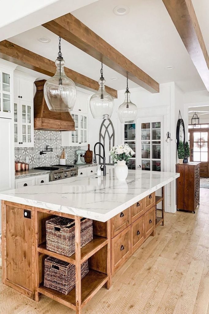 This modern farmhouse kitchen entrance feels fresh and full of charm. The open plan has a wood wall and a big island, perfect for easy meals. Black handles add a cool, modern touch, and plants make it soft and warm. As a decor fan, I love how it mixes old and new. Try adding a farmhouse sink for a true country feel. What’s your must-have farmhouse piece? Save this to your Pinterest and share your ideas below—I can’t wait to see your kitchen style!