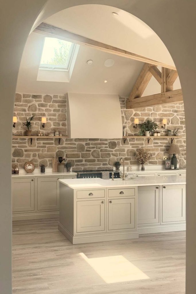 This modern rustic kitchen entrance feels cozy and stylish. Wood beams and smooth counters mix charm and class. The open plan connects to a warm dining area, perfect for friends or family. Soft tones and linen textures make it peaceful. As a decor lover, I love how it feels both calm and rich. Try a woven rug for a rustic touch. What’s your favorite rustic item? Save this to your Pinterest and share your ideas below—I’d love to see how you style your space!