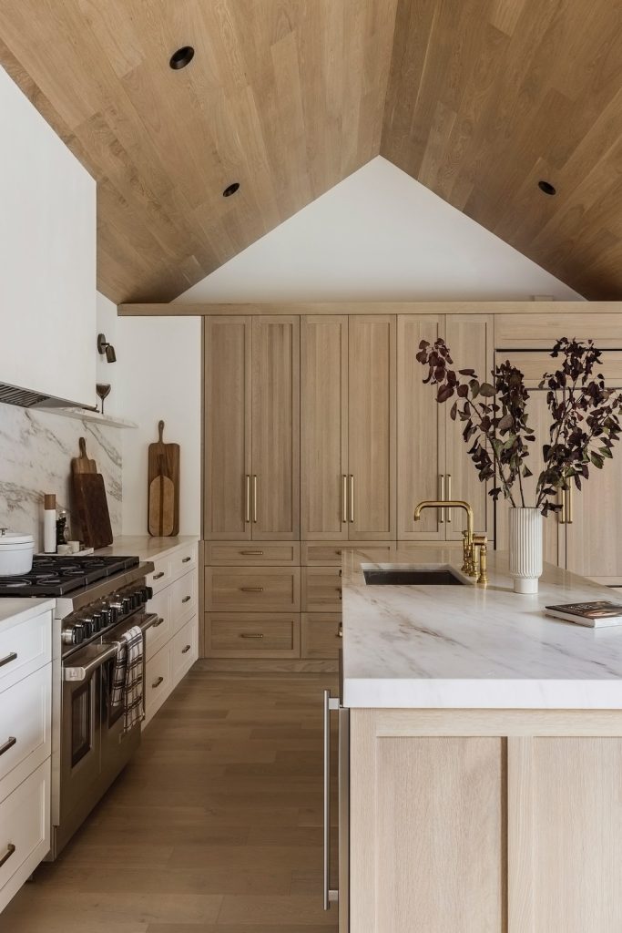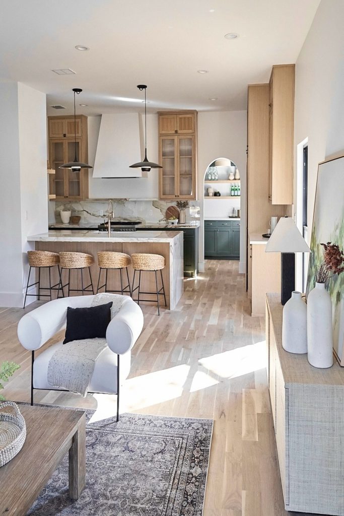 This kitchen entrance shows soft and calm design. Beige shades and natural wood make it feel peaceful. The open layout connects to a bright living room, perfect for guests. A woven light brings warmth, and green plants add life. As someone who loves design, I adore how simple and neat this looks. Clear your counters for that clean, open feel. What makes your kitchen cozy? Save this and share your ideas below—I’d love to hear them!