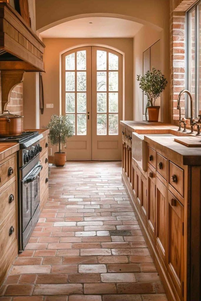 This kitchen feels warm and homey. Wood beams and soft colors make it cozy. The open space flows into the dining room. Family can gather easily. Reused wood counters and a butcher-block island help the planet. Brass lights and handles add charm. The U-shape keeps things close. Soft green colors add nature vibes. Perfect for 2025 trends. Want this style? Use wood and warm colors. Pin this and share your ideas!