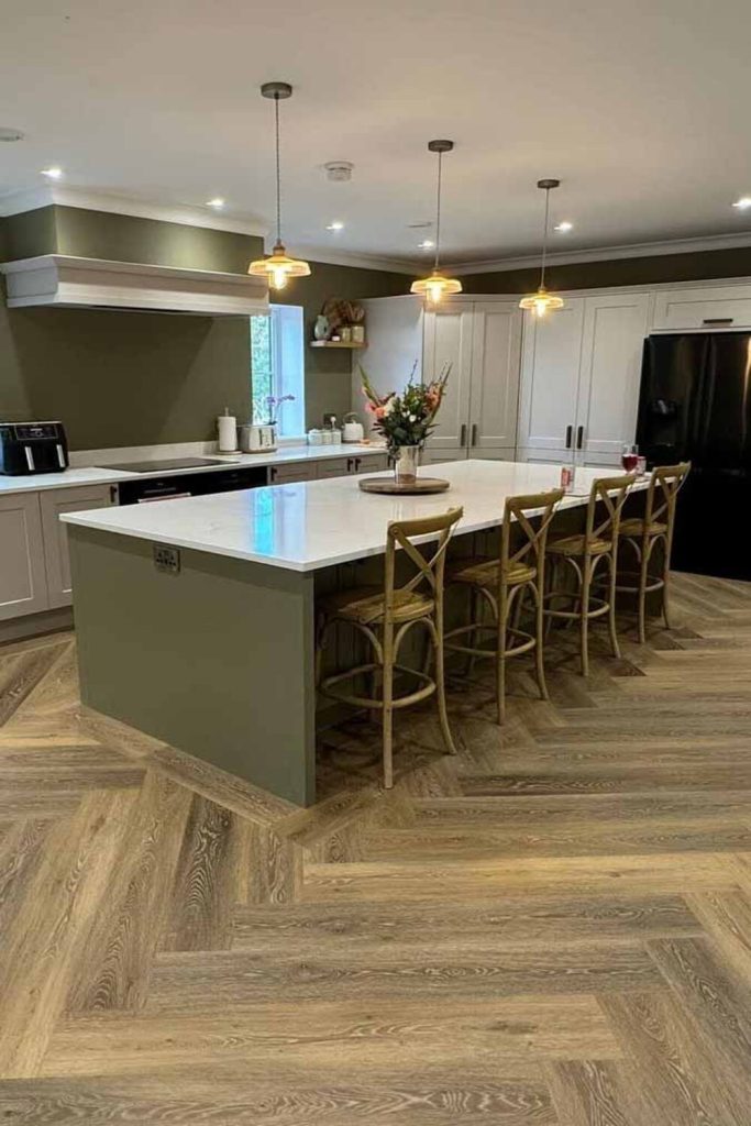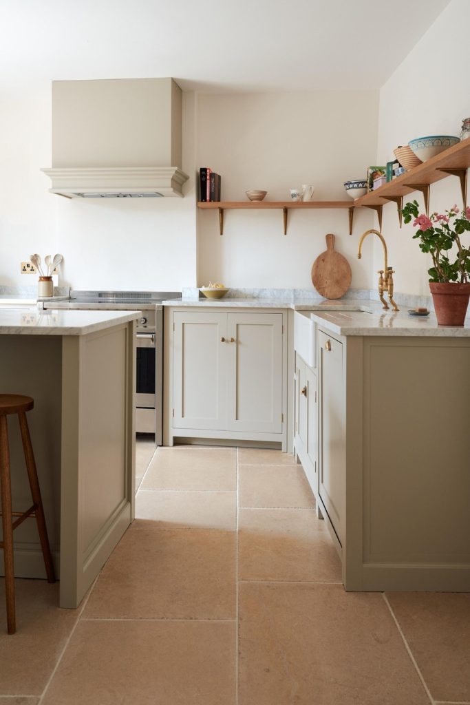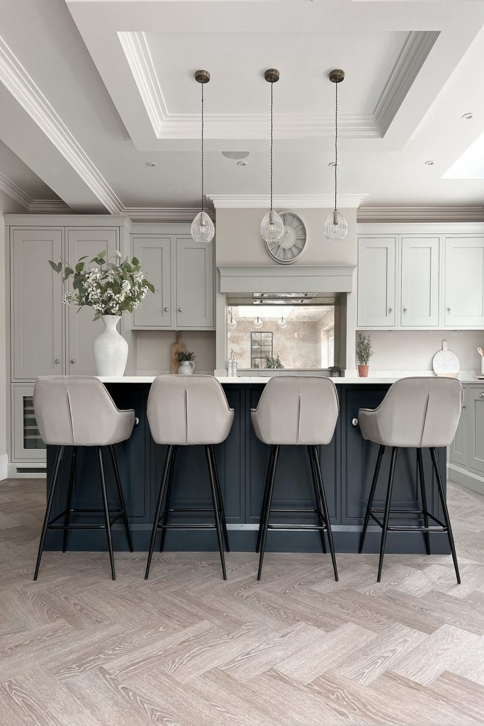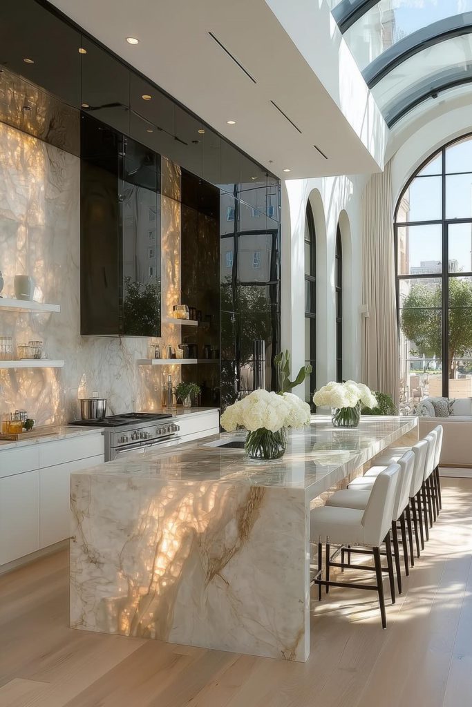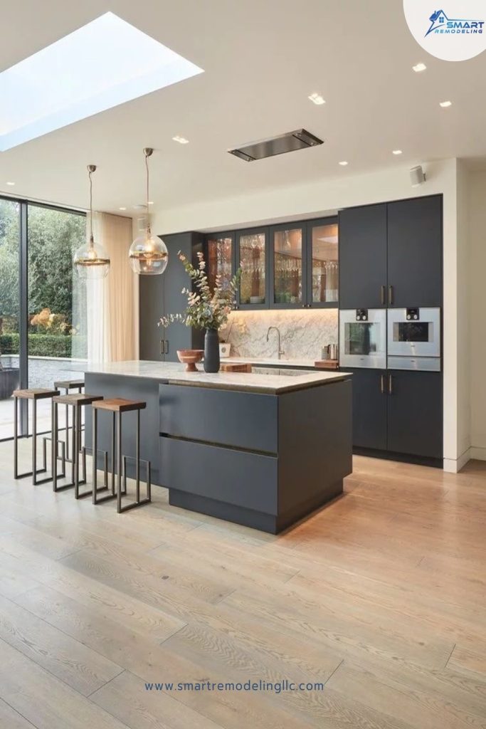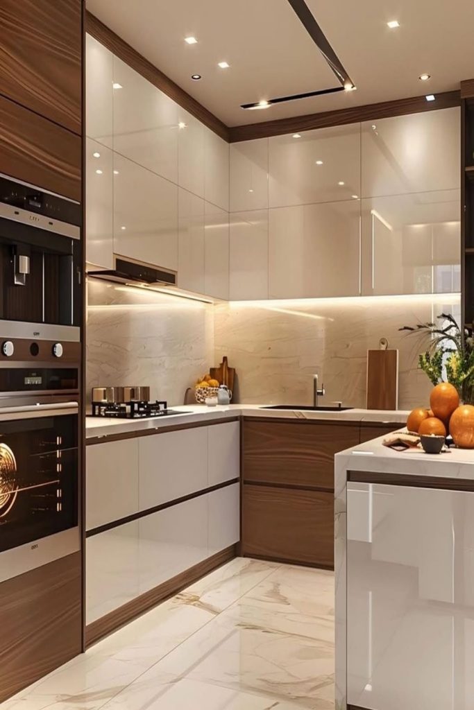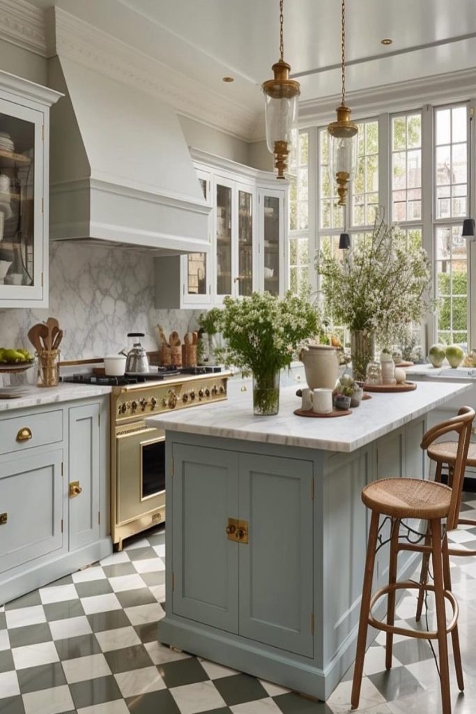 This kitchen feels timeless. Gray cabinets and marble tops look classy. The U-shape gives lots of space. Brass lights shine. Wood adds warmth. Open shelves hold dishes and decor. 2025 style mixes luxury and comfort. Want this look? Use calm colors and shiny metal. Pin and share your style!