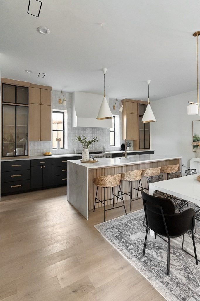 This kitchen is bright and neat. White cabinets and light wood counters look airy. Black handles add contrast. The open plan makes the space feel big. A small island is perfect for quick meals. Eco-friendly wood fits 2025 trends. Simple, stylish, perfect for small homes. Want this look? Use light wood and clean lines. Pin and show how you’d style it!