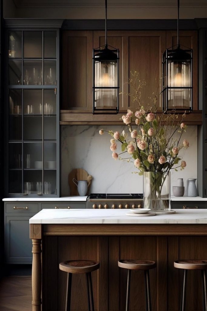 These urban chic kitchen glass cabinets are effortlessly cool. Matte black frames and smoked glass doors showcase sleek black dishware and metallic accents, aligning with 2025βs modern trends. The minimalist vibe feels so polished, and Iβm obsessed as a decor lover. Want this look? Keep displays sleek and add bold metallics. Pin this to your kitchen decor board and share your urban chic styling tips in the comments to spark more home decor inspiration!