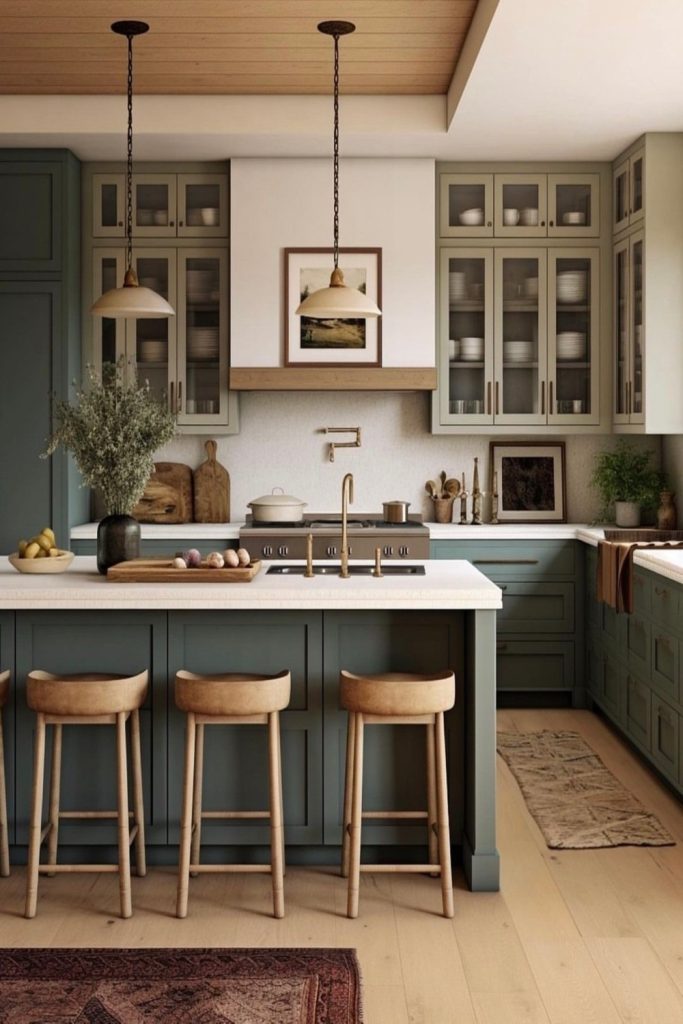 These kitchen glass cabinets radiate calm elegance. Soft gray frames and frosted glass doors display white dishware and woven trays, embracing 2025βs cozy minimalism. The neutral palette feels serene yet stylish, perfect for a clutter-free kitchen. Iβve styled countless serene spaces, and this oneβs a winner. Want this look? Keep displays minimal and add natural textures. Save this to your Pinterest for kitchen decor ideas and share your calming decor tips in the comments to inspire others!