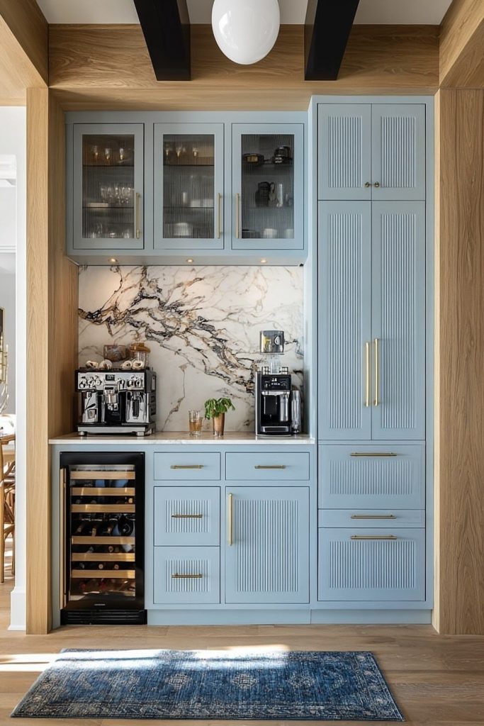 This coastal-inspired kitchen glass cabinet brings seaside serenity indoors. Soft blue frames and clear glass doors showcase white ceramics and woven baskets, evoking 2025βs breezy, sustainable trends. A few seashells add a personal touch, making it feel like a beachside retreat. Iβve styled coastal kitchens before, and this one nails the vibe. Want to try it? Add natural textures like rattan. Save this to your Pinterest for coastal decor ideas and share your beachy styling tips in the comments to inspire others!
