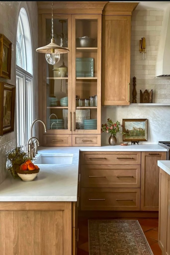These rustic modern kitchen glass cabinets blend cozy and sleek. Reclaimed wood frames and clear glass doors display white ceramics and woven baskets, tying into 2025βs sustainable decor trends. The mix of raw textures and clean lines feels fresh yet grounded. Iβve styled rustic spaces before, and this oneβs a gem. Want this look? Use natural materials and simple dishware. Save this to your Pinterest for kitchen decor ideas and share your rustic-modern tips in the comments!