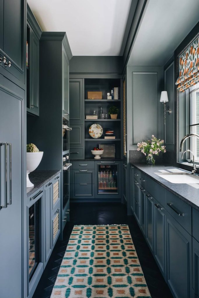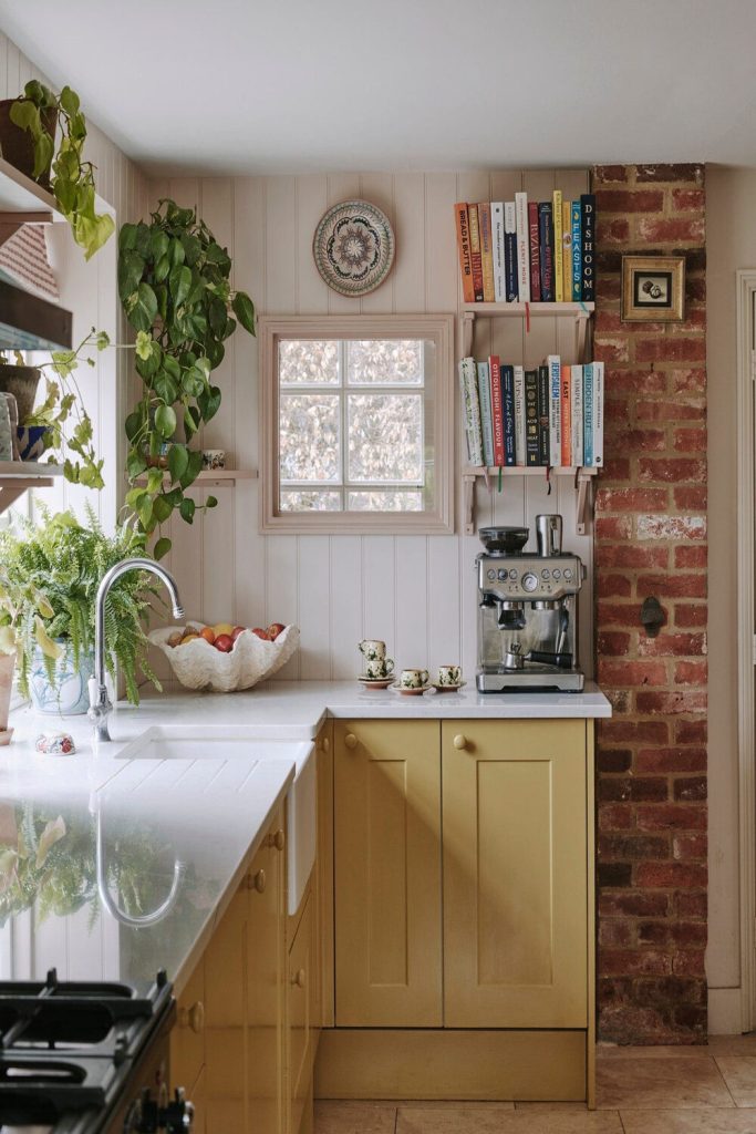 See a wide window with many green plants. Ivy trails down. Tall fiddle-leaf figs stand proud. The wooden sink and woven baskets add charm. Plants make the kitchen calm and alive. This setup is perfect for small spaces. Add a ceramic pot for style. Love plants? Pin this and share your favorite greenery for kitchen windows!