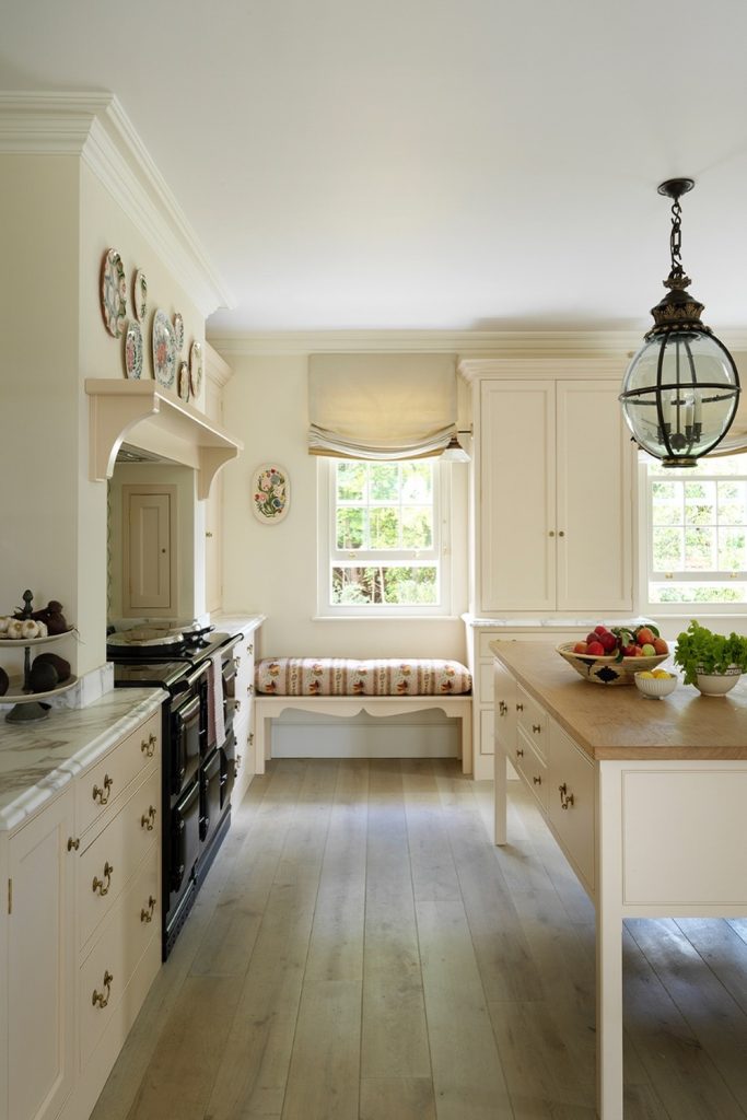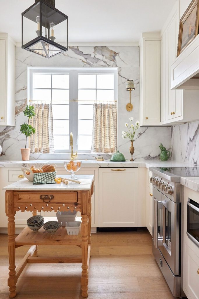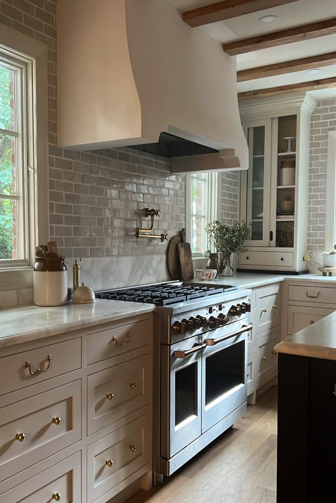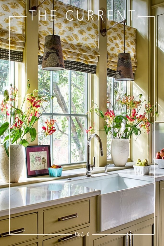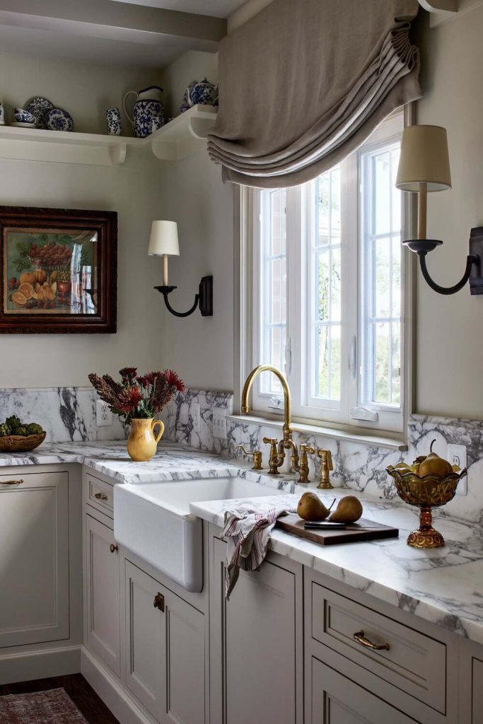 A double-hung window with white frames sits above a marble sink. Soft cream curtains make the space bright. This setup feels timeless and elegant. Small details like a crystal vase or brass accents add charm. It is perfect for traditional kitchens. Want a classic look? Save it and share how you’d style a window nook!