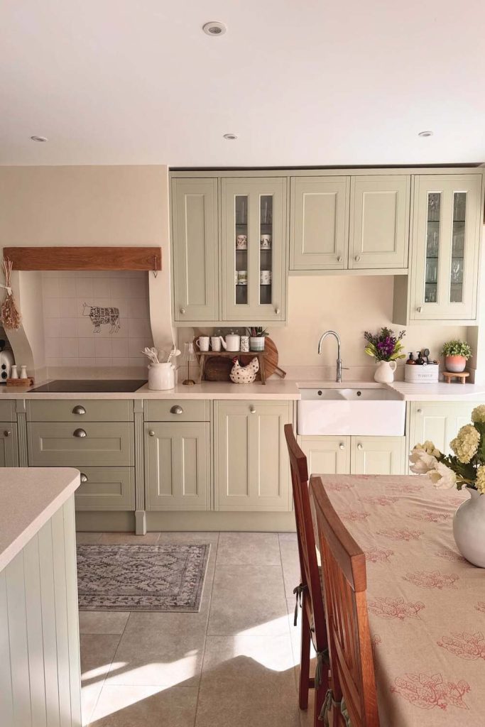 See a wide window with round arches. Terracotta tiles and olive green add a sunny, warm feel. Sunlight lights up baskets and ceramic jars. This gives charm and comfort. I love how rustic and fancy mix here. Perfect for a cozy kitchen. Add a lemon plant for freshness. Love Mediterranean style? Pin this and share your warm kitchen tips!
