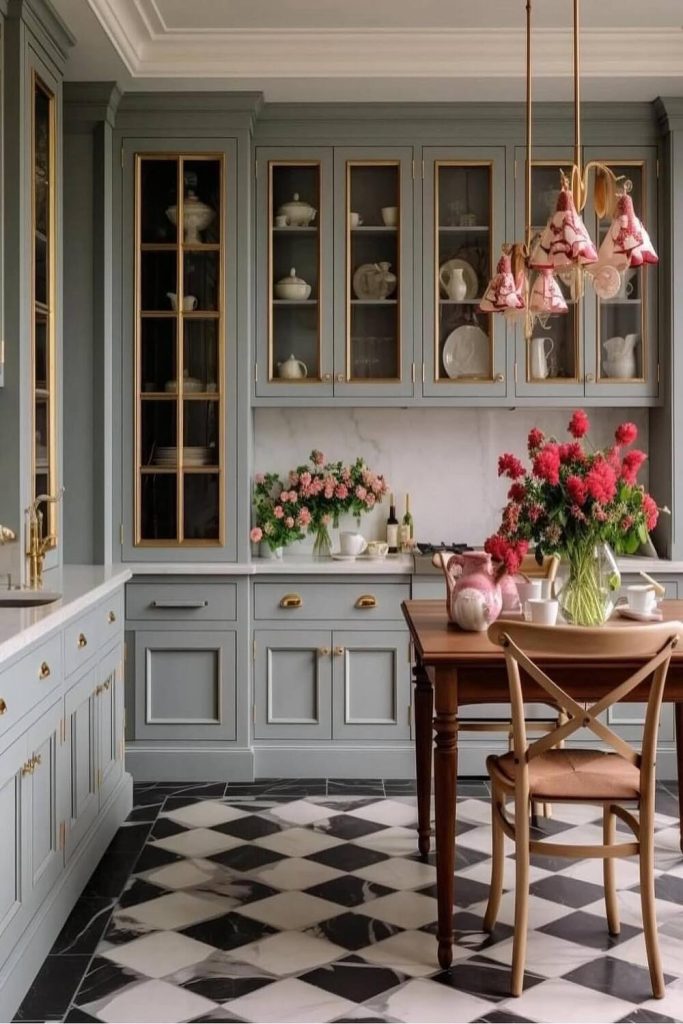 See a classic double-hung window with light, sheer floral curtains. Soft light fills the kitchen. A ceramic sink and brass handles feel timeless. The delicate patterns add charm without clutter. This setup makes a cozy kitchen. Add a small vase of wildflowers for extra flair. Love vintage style? Pin this idea and share your retro finds!