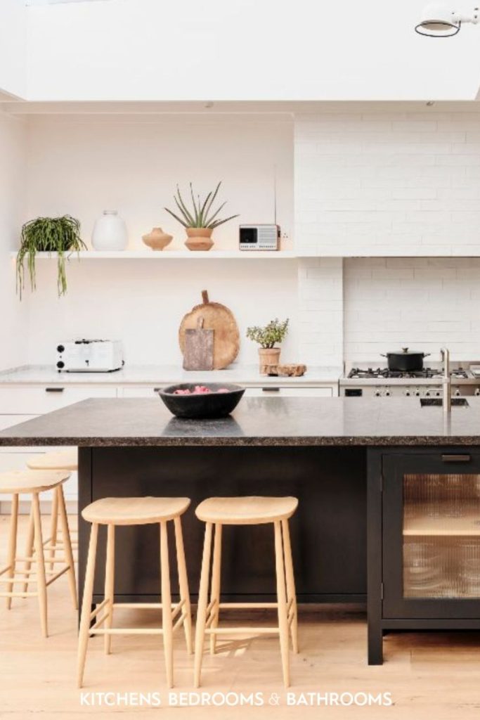 This kitchen island shows cozy minimalism at its best. The white island stands out against black cabinets. Open shelves show pretty ceramics. Gray walls make the room feel calm and airy. Small kitchens love this setup. It works for cooking and casual dining. Add a small plant for a lived-in feel. Pin this and tell us your favorite detail!