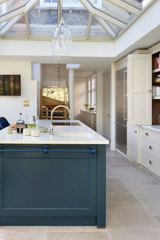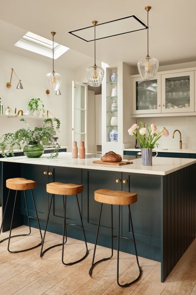 This navy kitchen island really stands out. Brass handles and creamy countertops make it stylish. The open space invites conversation. Quartz counters are strong and eco-friendly. A few herbs bring life to the room. Try a bold color on your island for impact. Share your favorite kitchen colors below!