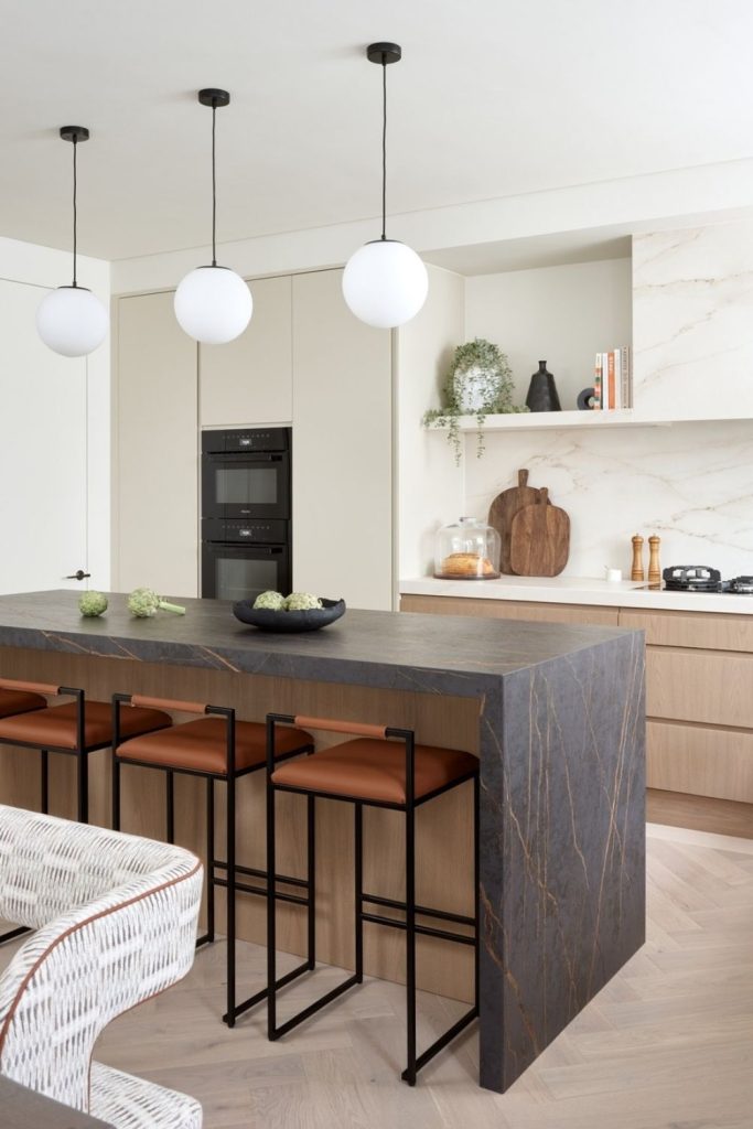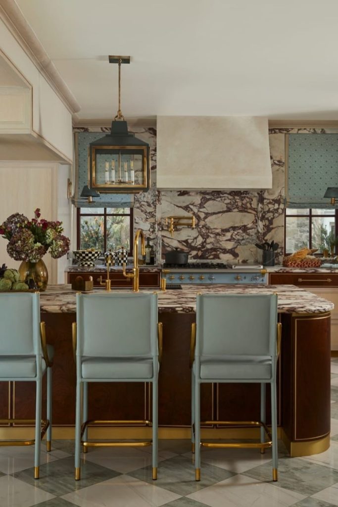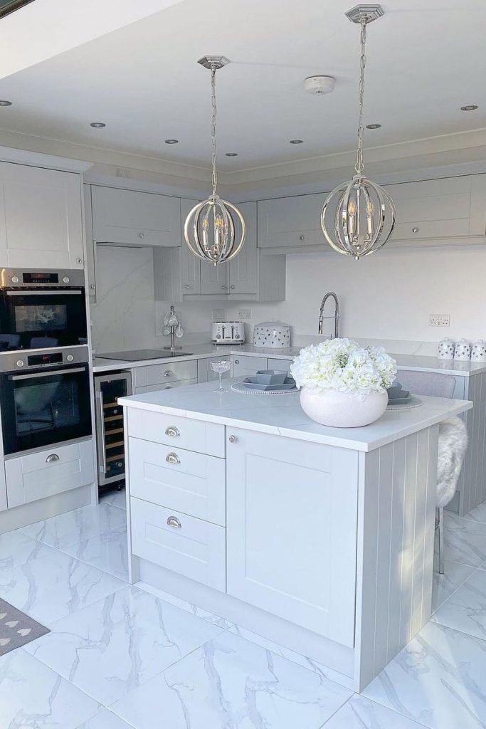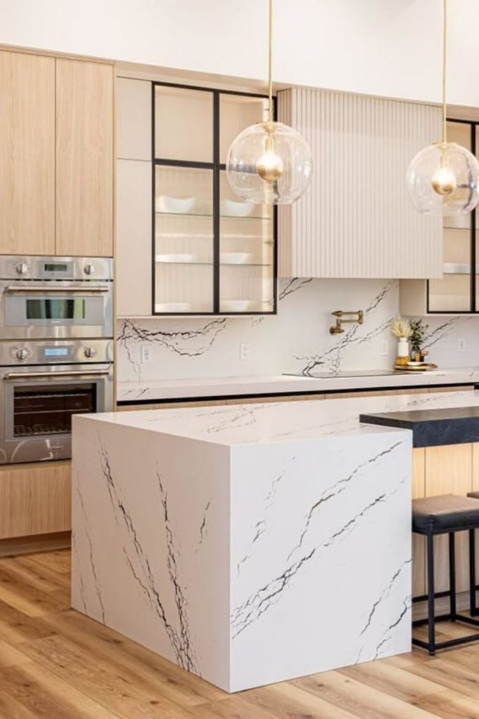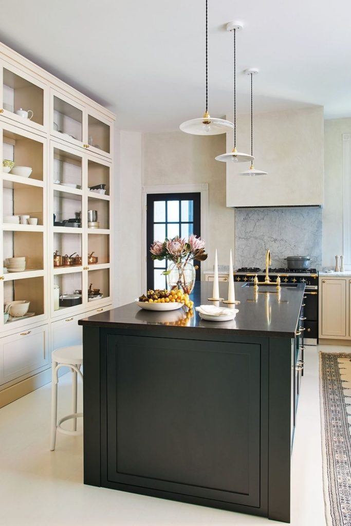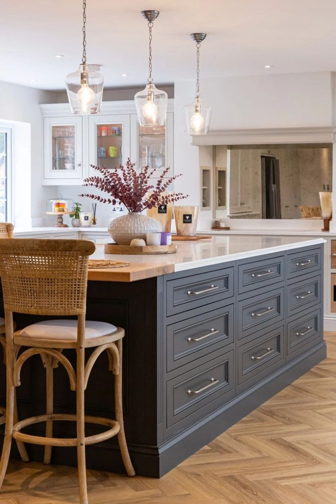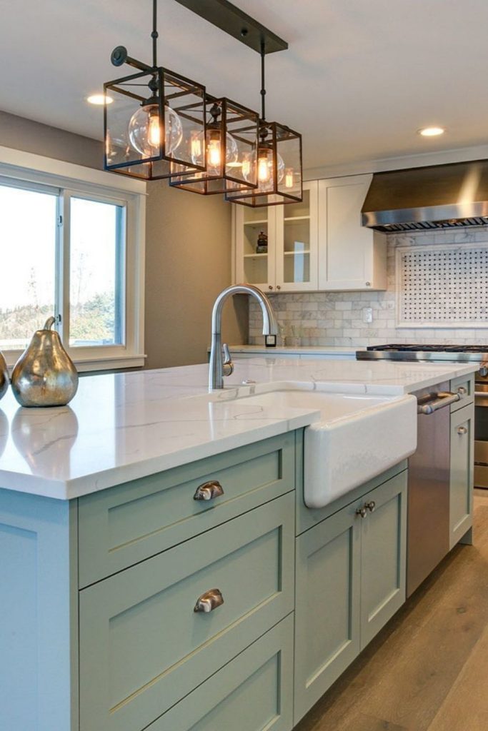 This kitchen island looks amazing with its marble top. The soft gray lines are very pretty. Creamy cabinets make it warm and welcoming. Gold pendant lights add a little glam. The island is large enough for cooking or dinner parties. Tip: Use marble a little to save money. This style is always chic. Pin this and share your dream island below!