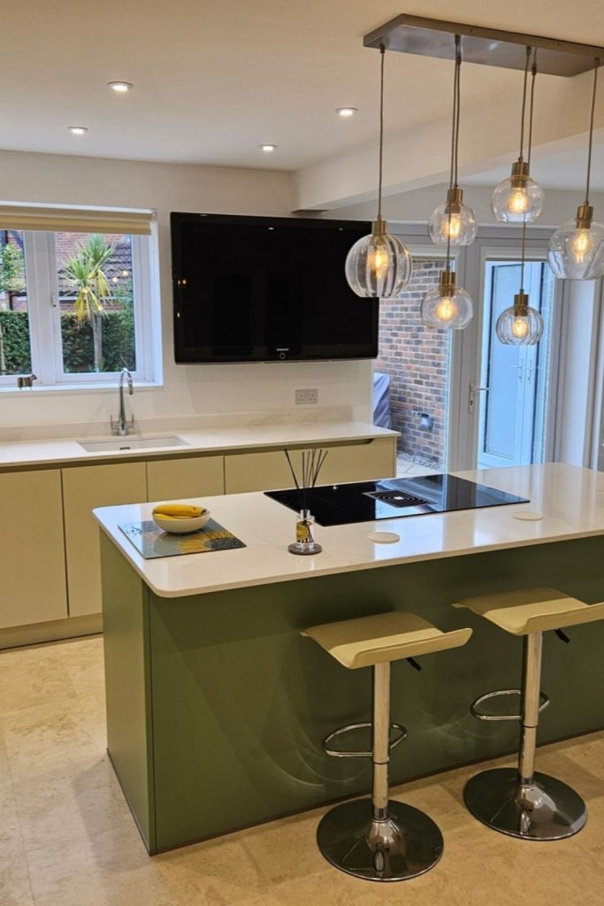 Even small kitchens can be stylish! A slim white island saves space. Light wood stools make it airy. Green backsplashes add a fresh touch. Open shelves keep essentials handy. Add candles for cozy vibes. Pin this and share your favorite small-space tips!