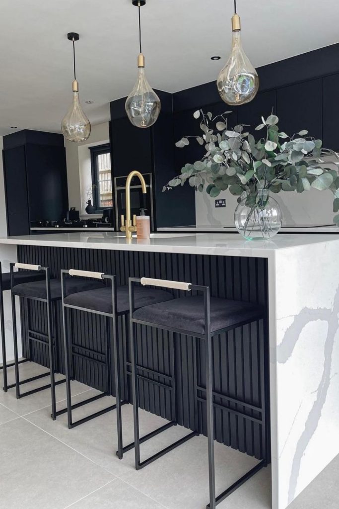 This kitchen island is bold with black and marble. Gold handles add glam. The open design makes it social. Dark gray walls feel moody but nice. It is perfect for dinner parties or brunch. Tip: Balance dark colors with shiny accents. Pin this and share how you would style a bold island!