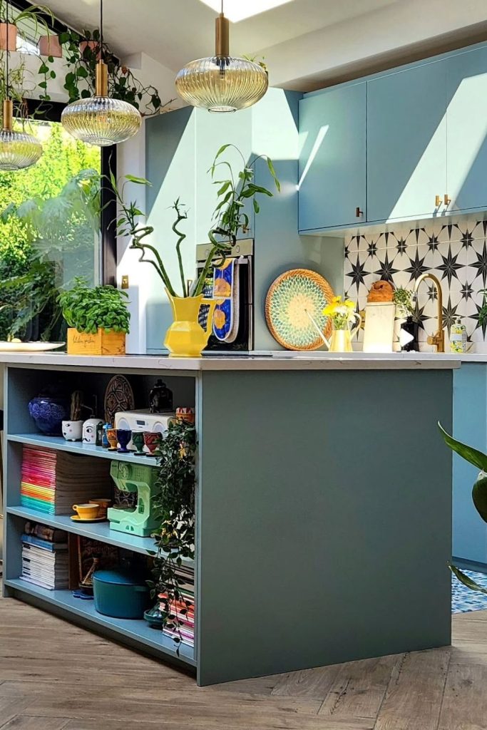 This island is bold and full of charm. The teal island with a wood top feels fun and useful. Vintage tiles and brass hardware add flair. It works well in small kitchens. Tip: Pair bold colors with neutral walls. Love this look? Pin it and share how you’d add a pop of color!