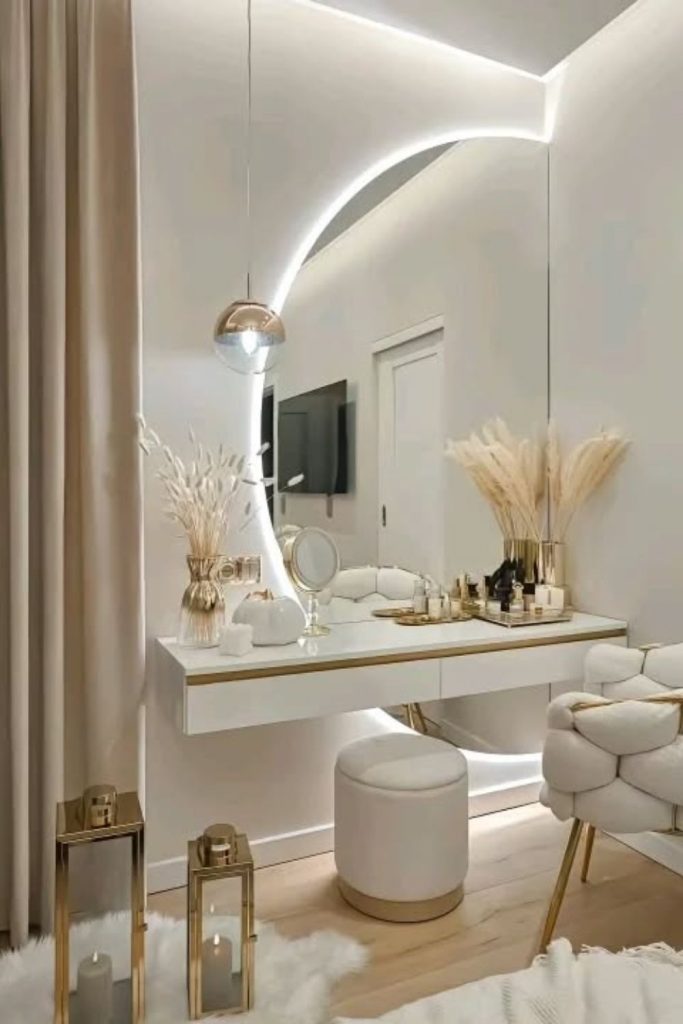 This fancy bedroom shines with LED lights around a chic mirror. The soft light adds a luxe feel, highlighting cozy textures and shiny metals. It blends elegance with eco-friendly lights. I love how LEDs lift this look cheaply. Want a luxe bedroom? Save this or share your mirror lighting tips!