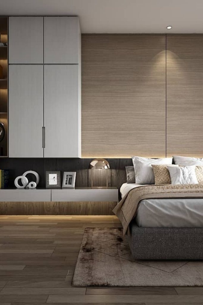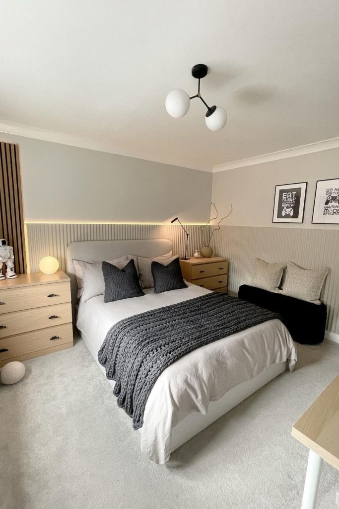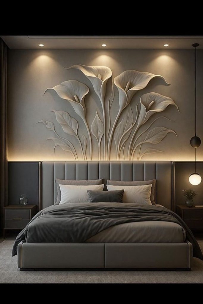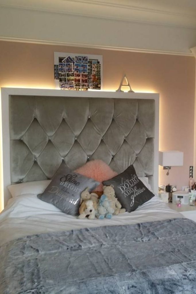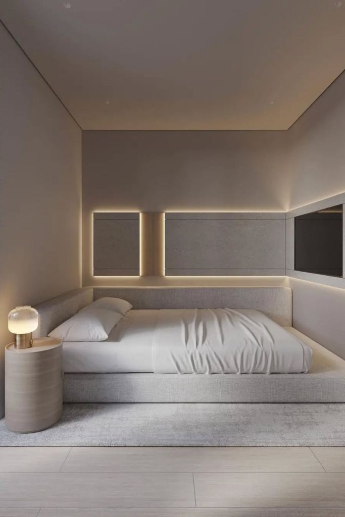 Lights behind the headboard make a sleek room. Gray and cream keep it cozy. Lights add a cool feel. I love simple lights with no mess. Want a chic room? Try this and share ideas!