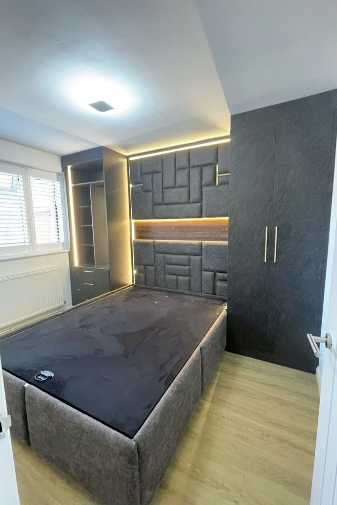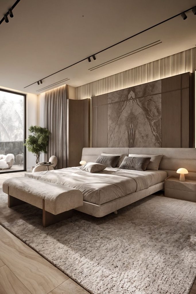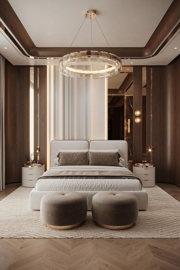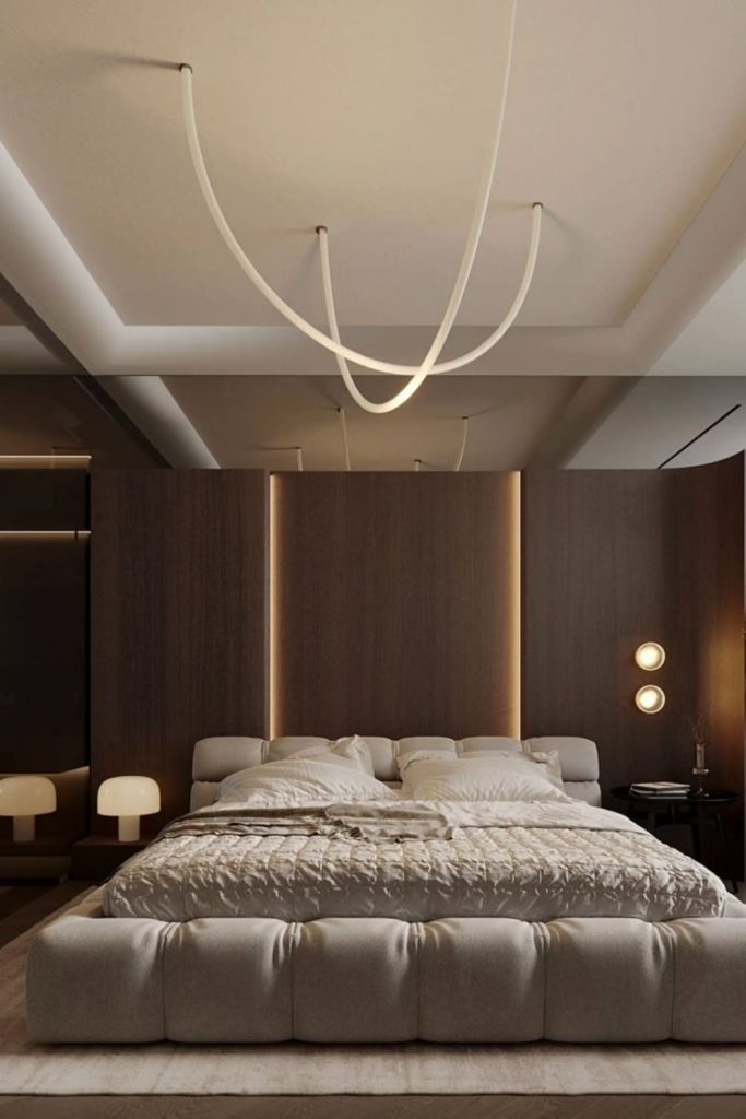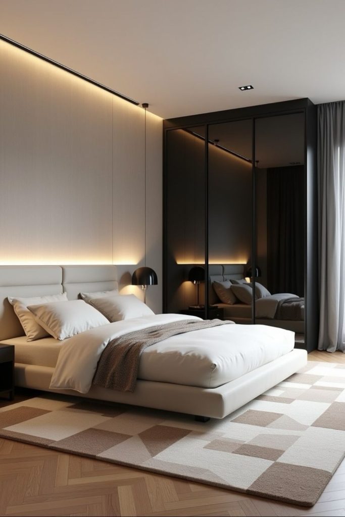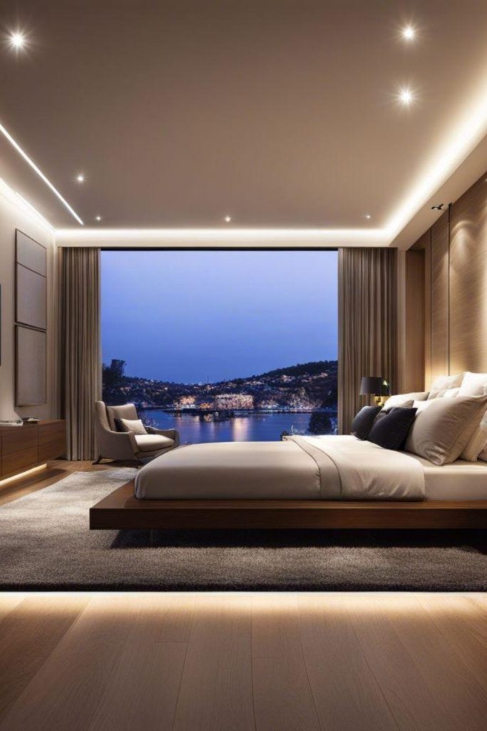 This sleek room glows under the bed. The warm light makes it look like the bed floats. The clean colors keep things simple and smart. The LED lights look cool and save energy. Want to do this at home? Try under-bed lights for a soft glow!
