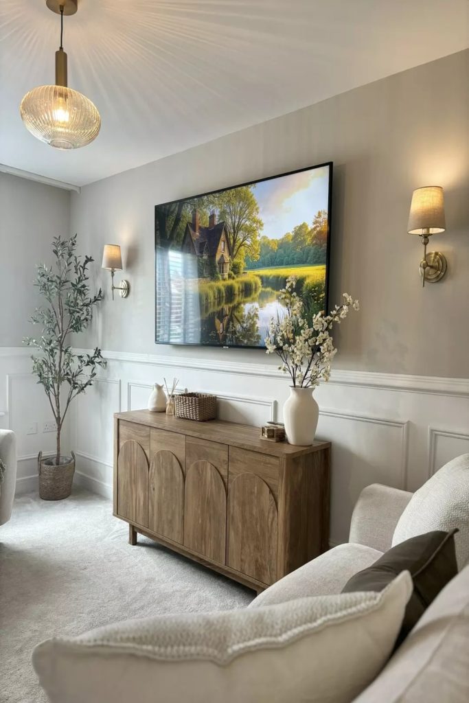 A wagon wheel light is pure farmhouse fun. White shiplap makes things fresh. Your room feels ready for family. I fixed an old wheel for a client. I sanded it, sealed it, and added new wires. Use fake candle bulbs that look real. Keep chairs simple: big rug, brown couch. It is cozy and cheap. Perfect for cold nights. Save this cute look!