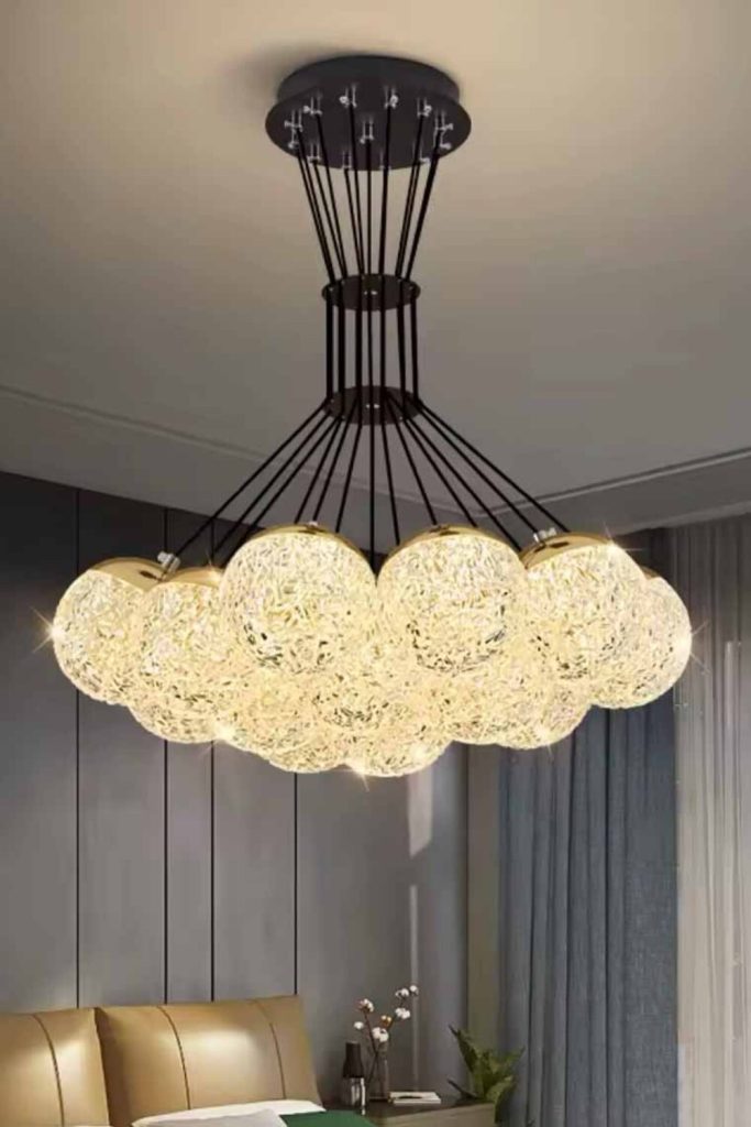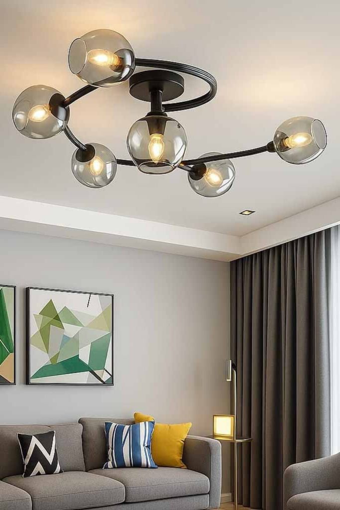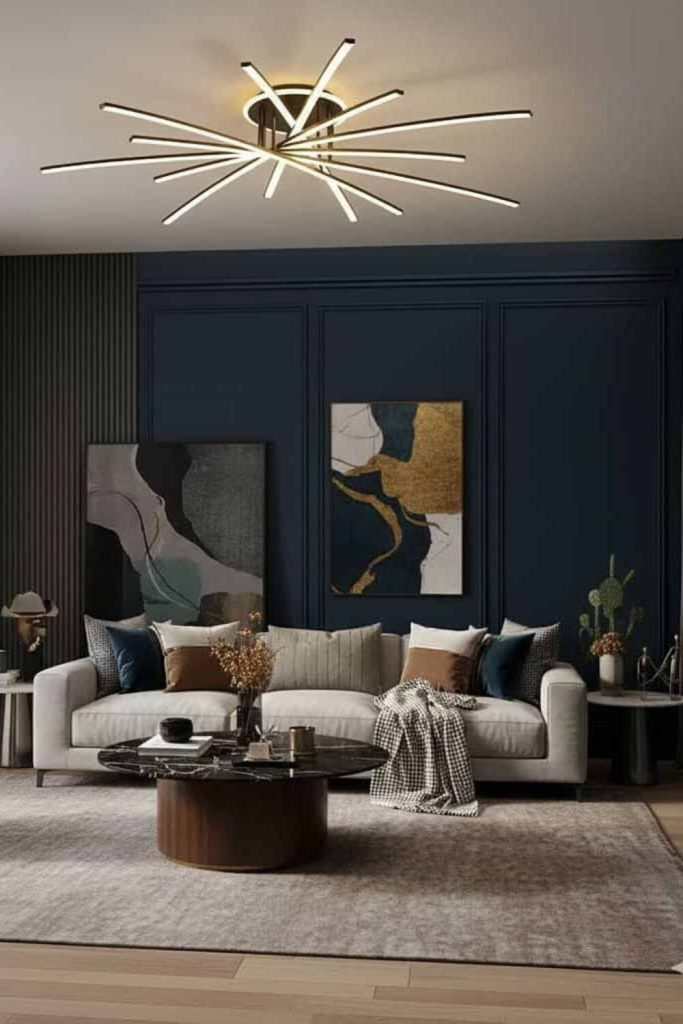 Japandi = best of both worlds. These oversized paper lanterns float above a low-profile sofa, blending Scandinavian minimalism with Japanese serenity. I love rice paper for its soft diffusion—swap for LED bulbs to avoid heat. Keep the palette muted: oak, linen, clay. It’s a ceiling lighting design that whispers calm. Pin this zen moment and share your quiet corner!