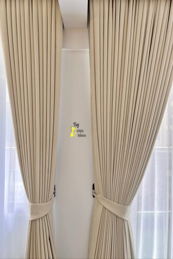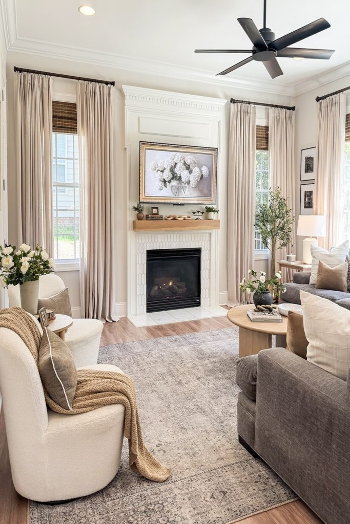 Double curtain layers are fun. Thick oatmeal ones go over thin ivory ones. The colors are almost the same. It looks like very fancy drapes. I used this in my big open home. The TV spot felt cozy and alone. Use clip rings. They make changes fast. This neutral curtain palette fits all seasons. Add yellow or purple pillows for color. Fall curtain trends love these soft shades. Curtain rod styling tip: make it longer. Go twelve inches past the window. Your room looks much wider!