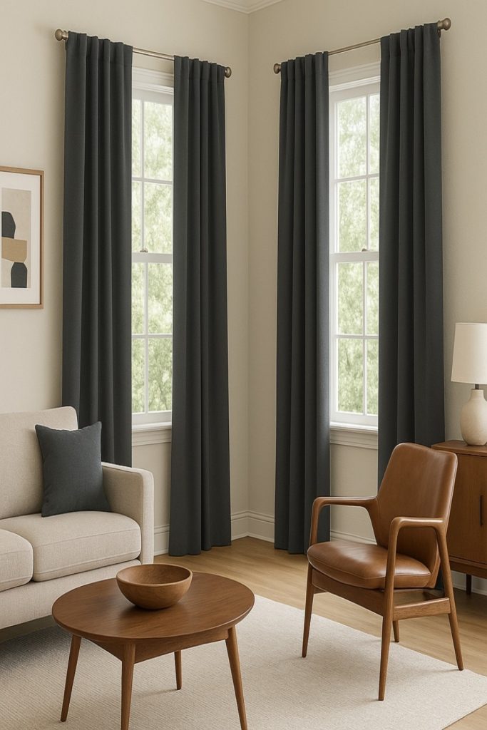 This idea is so smart. Put dark blackout linen in back. Put white sheer curtains in front. Morning light stays soft and nice. Movie time gets very dark. Use two rods. You move each layer alone. I did this in my kid’s room. Nap time became easy! Pick cotton blackout curtains. Follow this curtain length guide. Let them puddle a bit for pretty. Or stop one inch up if pets run around. Blackout vs sheer curtains are best friends. These sustainable curtain fabrics look good and work great.