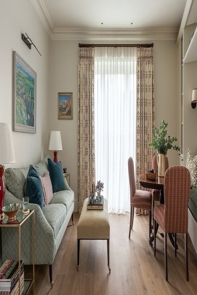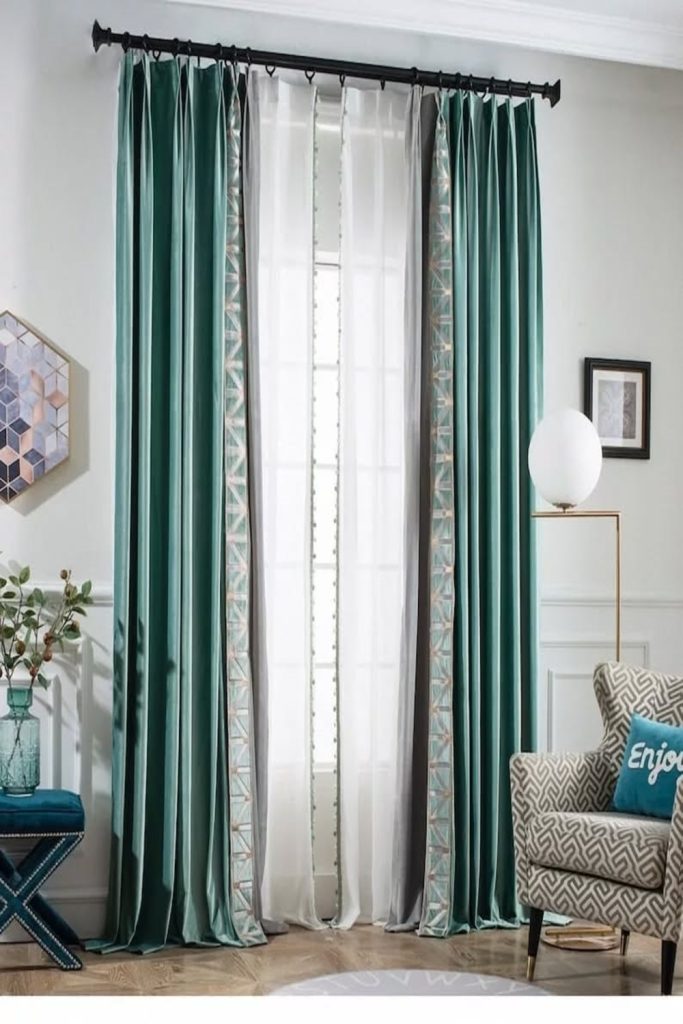This look makes me smile. Long sage linen curtains go to the floor. They make hard windows feel soft. Thin panels mix with thick ones. Light comes in soft and pretty. The room feels full of air. A brass rod adds warm light. My tip: hang rods high. Put them six to eight inches above the frame. Your room looks taller and fancy. These curtains help the earth. You can wash them easy. They make any room cozy fast. I love cozy living room curtains like this. Pin it for your linen curtain refresh!