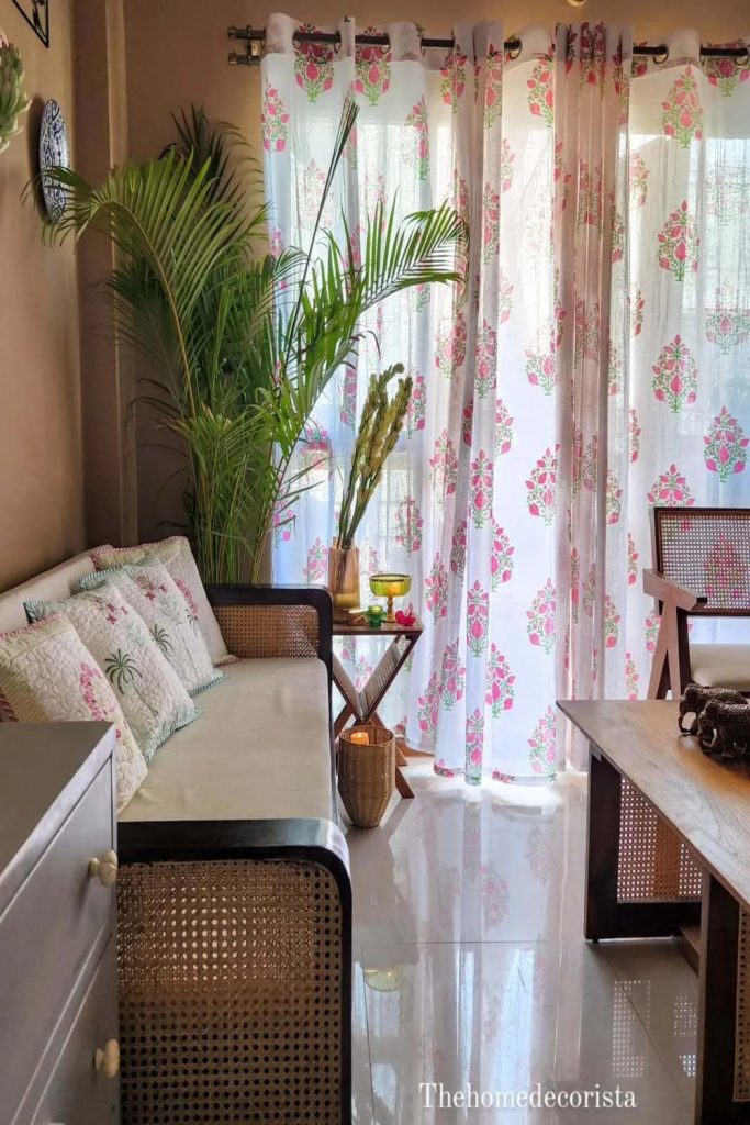 Do patterns scare you? Do not worry! Start with soft shapes. These quiet shape curtains add joy. They stay calm. Keep most chairs and sofas plain. That makes the room peaceful. I used them in my fun room. Everyone talks about them! Pick cotton that helps the earth ». Easy fix: sew trim on plain curtains. Great boho curtain inspo. Curtain length guide: let them touch the floor a bit. It looks new and fresh. Pin this now!