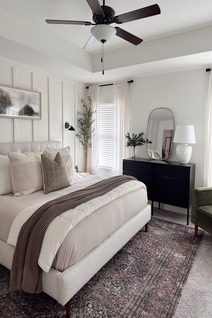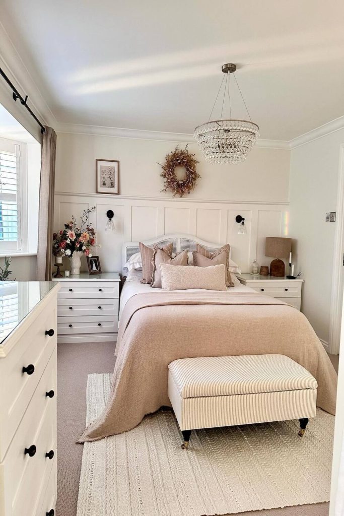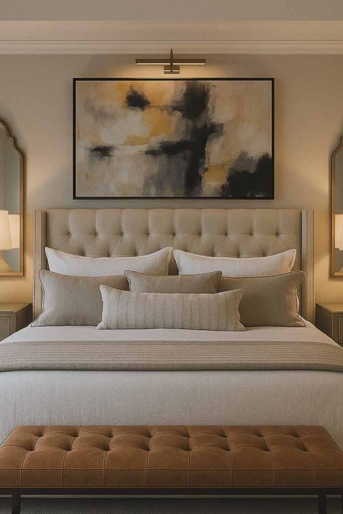 This master bedroom radiates timeless elegance with its soft cream palette and classic upholstered headboard. The delicate lace curtains and vintage-inspired nightstand add a touch of charm without feeling dated. I love how the neutral tones create a serene, versatile backdrop—perfect for any season. It’s a master bedroom styling idea that feels both luxurious and approachable. Want to recreate this? Stick to classic pieces and soft textures. Pin this for inspiration and share your favorite classic decor tips in the comments—I’m all ears for your ideas!