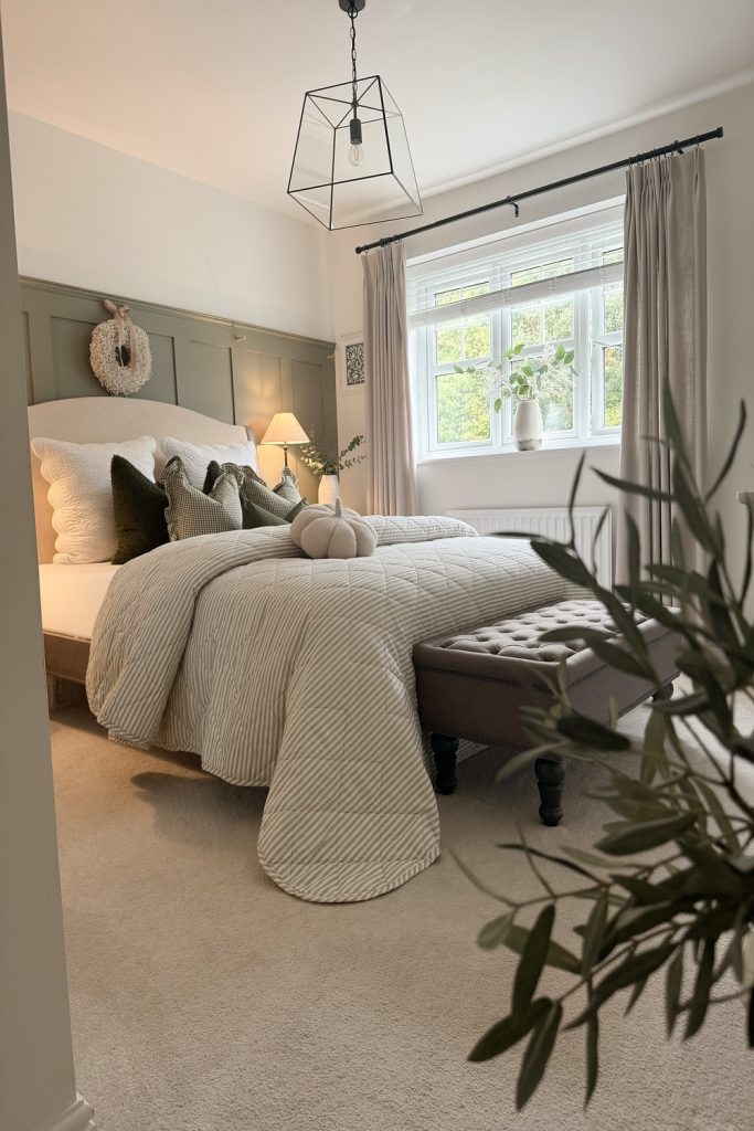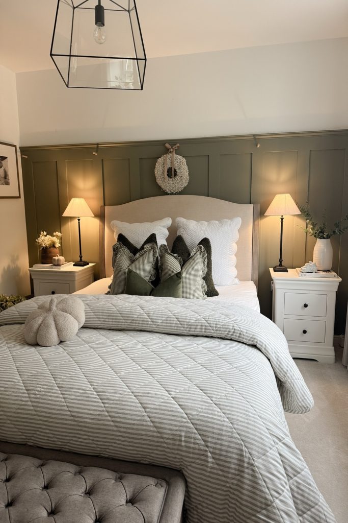 This bedroom radiates farmhouse charm with its shiplap walls and cozy plaid bedding. The warm wooden accents and soft lantern lighting create a welcoming, lived-in feel. I love how the neutral palette with pops of green feels fresh and on-trend. It’s a perfect master bedroom refresh for anyone craving rustic coziness. Want to try this? Layer natural textures like wood and cotton. Save this for your next decor project and share your farmhouse decor ideas below—let’s swap tips for that cozy, homey vibe!