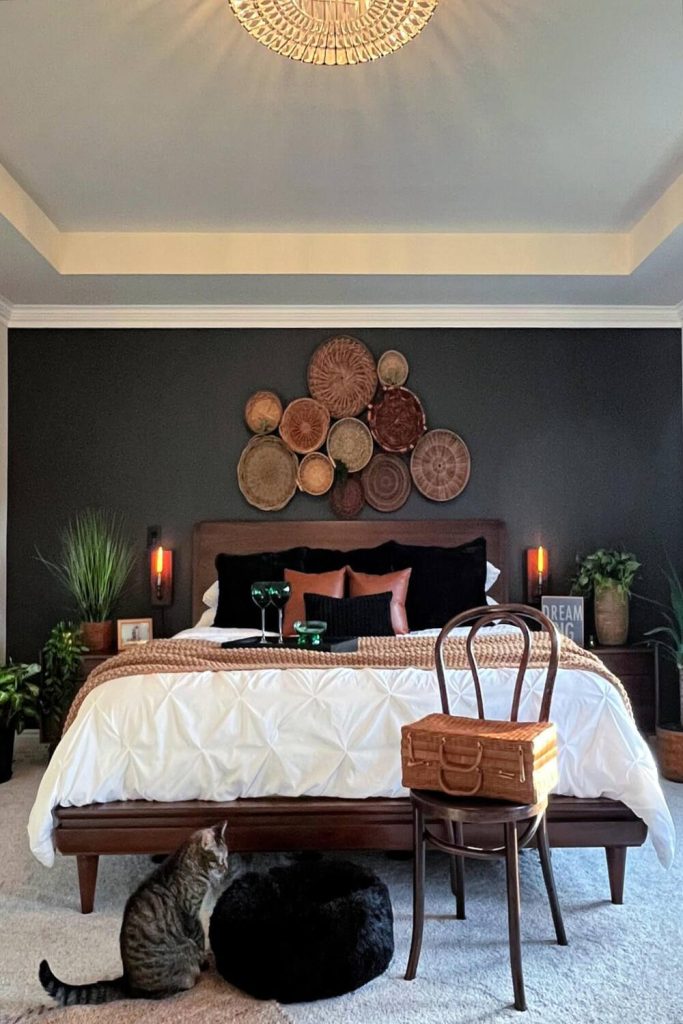 This bedroom is a boho dream with its earthy tones and layered textures. The terracotta bedding and woven wall art create a warm, inviting vibe. I love the mix of natural materials like rattan and linen, which scream sustainable decor. The soft lighting from the bedside lamp adds a cozy touch, perfect for a master bedroom styling idea. Want to bring this vibe home? Layer neutral textiles with pops of color. Pin this for your next decor project and share your boho styling tips below—let’s inspire each other!