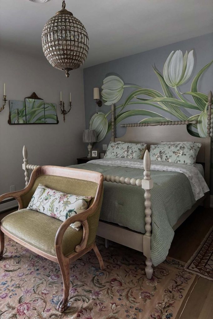 This bedroom blends vintage charm with modern comfort. The soft floral bedding and antique brass lamp create a nostalgic yet fresh vibe. I love the muted sage green walls that add a calming, on-trend touch. It’s a master bedroom styling idea that feels personal and timeless. Perfect for anyone craving a cozy, lived-in look with sustainable touches. Want to recreate this? Mix vintage finds with modern neutrals. Pin this for inspiration and share your vintage decor ideas below—let’s swap tips for that perfect retro vibe!