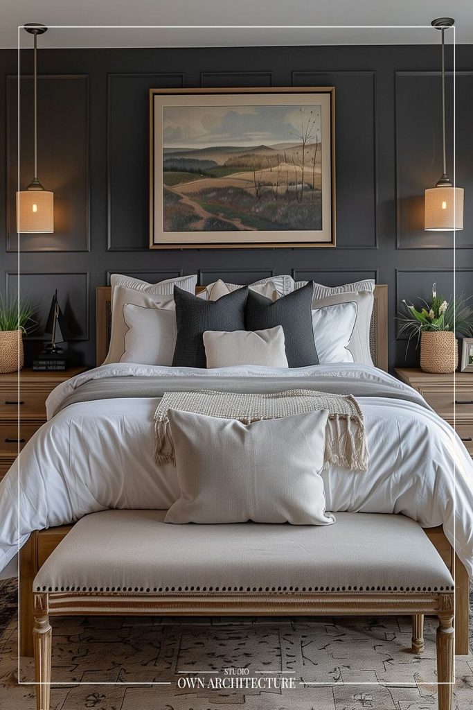 This bedroom is a showstopper with its rich jewel-toned palette and plush velvet bedding. The deep emerald green accents and gold-trimmed decor scream luxury. I love how the bold colors are balanced with neutral walls, keeping it cozy yet sophisticated. It’s a master bedroom styling idea for anyone craving drama. Want to recreate this? Use bold hues sparingly with metallic accents. Pin this for your next decor project and share your jewel-toned decor tips in the comments—I’d love to hear how you add bold vibes to your space!