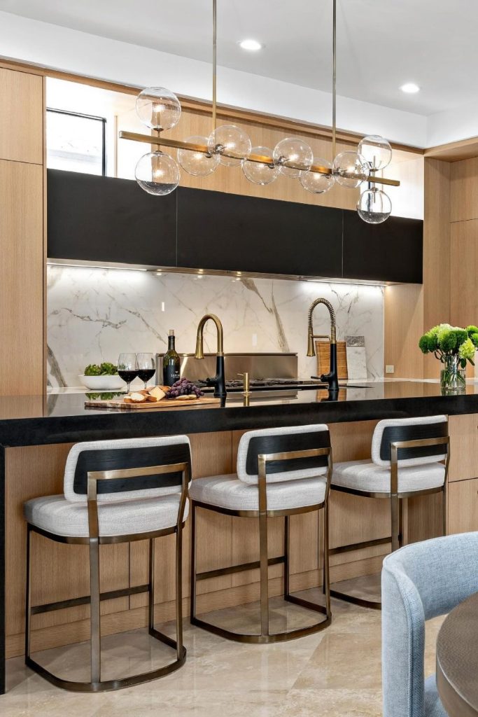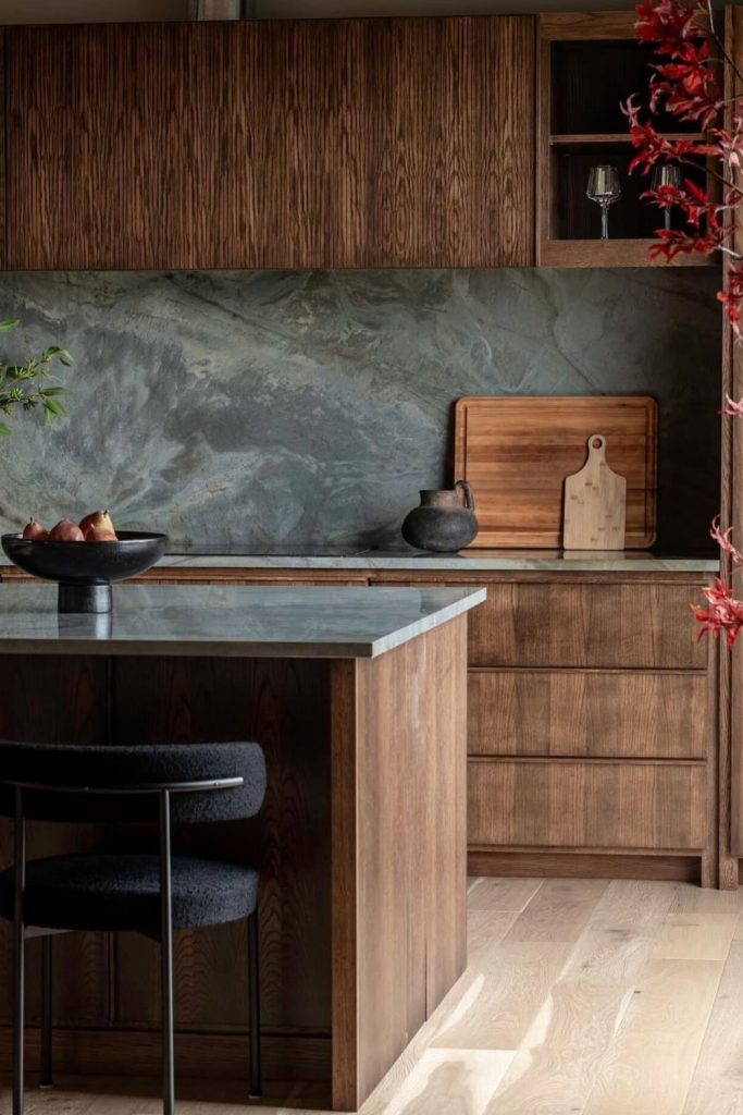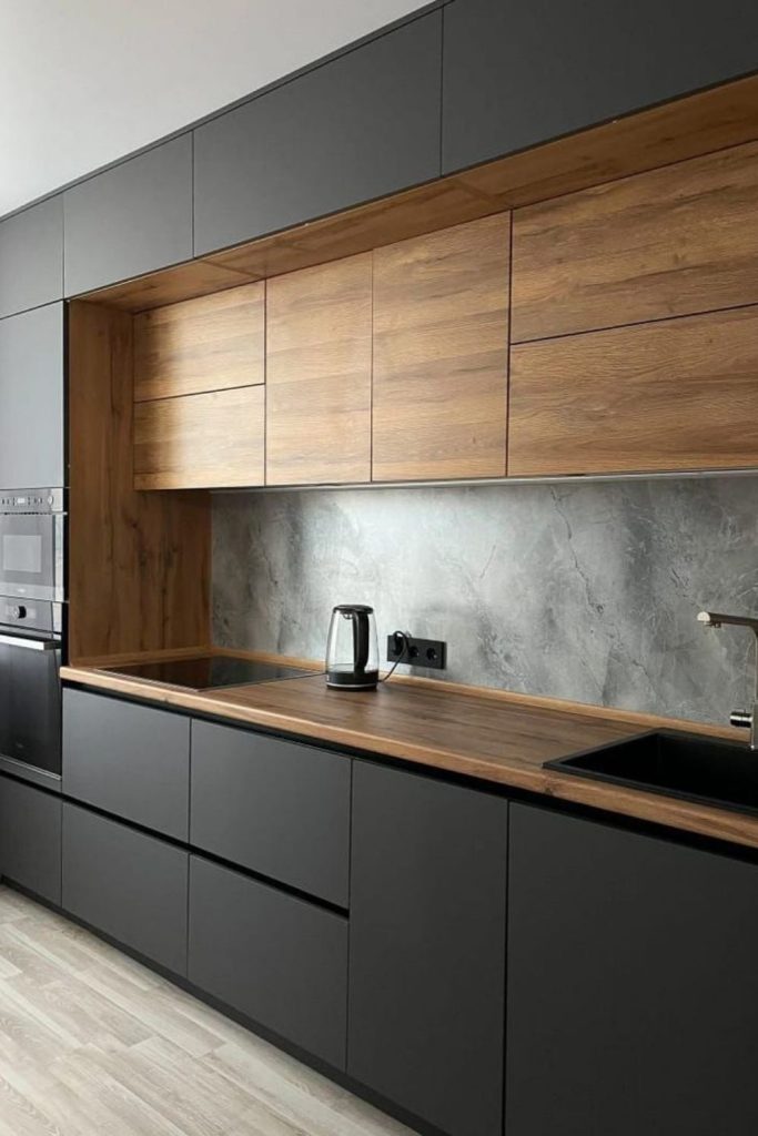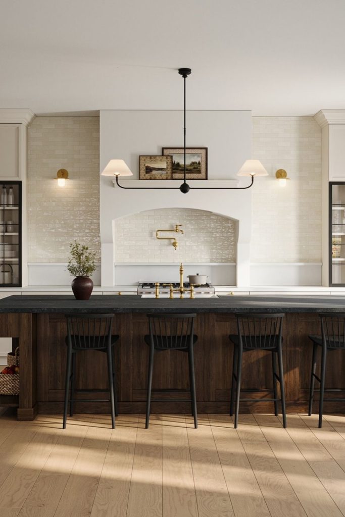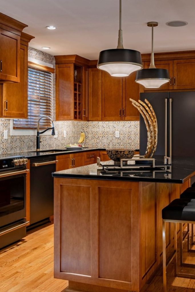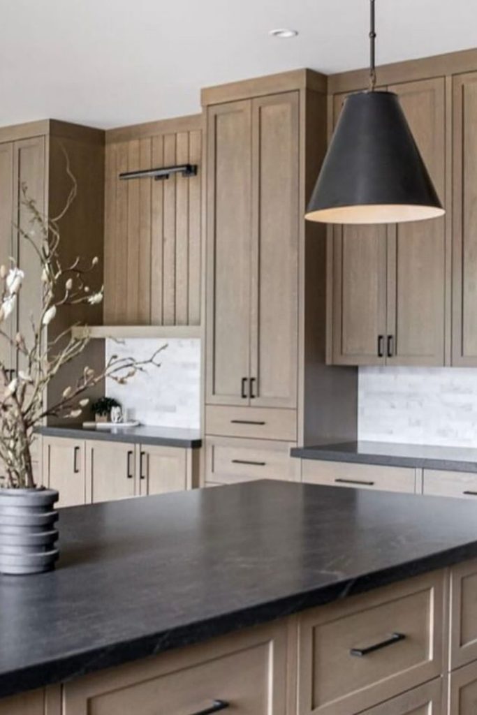 This kitchen is pure warmth! The black countertops pop against honey-toned wooden cabinets, creating a modern yet inviting space. Brass hardware and a ceramic vase with eucalyptus add cozy elegance. I’m obsessed with how the black counters tie everything together, making the space feel grounded. For your kitchen, try pairing black countertops with warm wood tones for that perfect balance. It’s a trend that’s here to stay in 2025! Pin this for inspiration and drop your favorite kitchen decor tip in the comments to inspire others!
