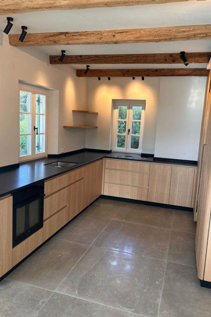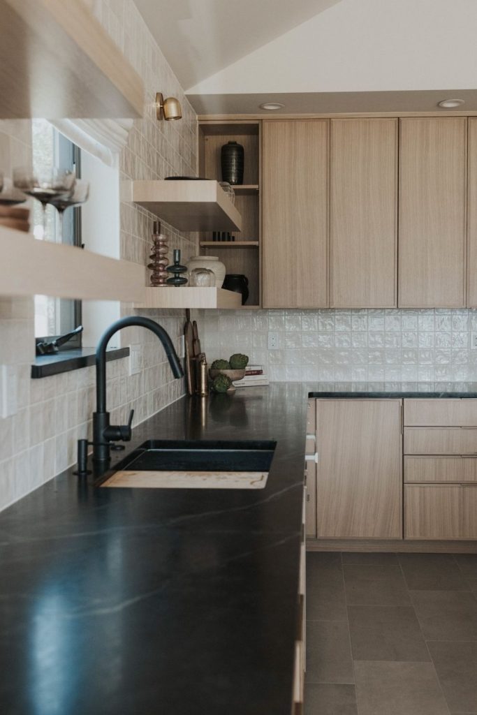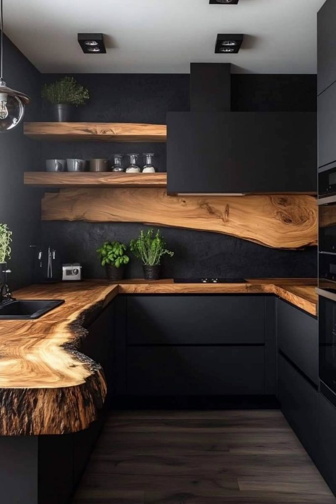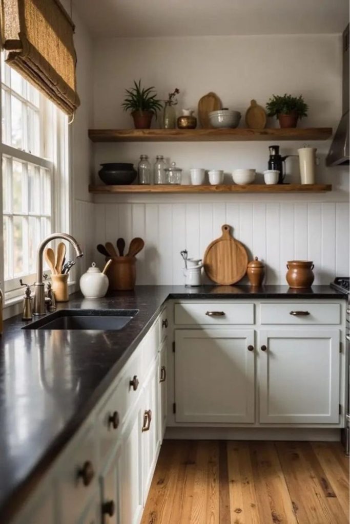 This kitchen feels like a warm embrace! The black countertops contrast with terracotta tiles and wooden shelves, creating an earthy, modern vibe. A ceramic vase with dried branches adds organic charm. As a decor lover, I adore how black countertops ground the space, letting natural tones shine. For your kitchen, try earthy colors like sage or clay for a cozy feel. Pin this for inspiration and share your favorite earthy decor tip in the comments to spark ideas for others!