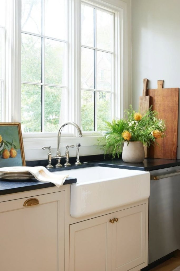 2. Cozy Farmhouse Kitchen with Black Countertops