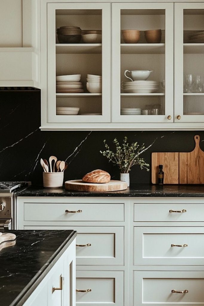 This kitchen is a showstopper! The glossy black countertops steal the spotlight, reflecting light for a polished, modern vibe. Paired with crisp white cabinetry and gold hardware, it’s a perfect blend of bold and elegant. The open shelving with curated ceramics adds a cozy, lived-in feel, while a potted herb plant brings in sustainable charm. As a decor lover, I’m obsessed with how the black counters anchor the space, making it feel both luxurious and inviting. Try adding warm accents like wood or brass to soften the look. Pin this for your next kitchen refresh!