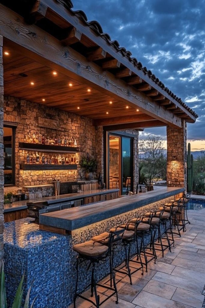 This coastal-inspired outdoor kitchen feels like a seaside escape! The whitewashed wood and navy blue accents evoke beachy vibes, while the stone countertop adds durability. I love the rope-wrapped bar stools that scream nautical charm, perfect for 2025’s natural material trends. The open layout is ideal for summer gatherings by the pool. Picture serving fresh seafood here! Want this coastal look? Use weathered textures and cool tones. Pin this for inspiration and drop your favorite beachy decor ideas below to keep the coastal dream alive!